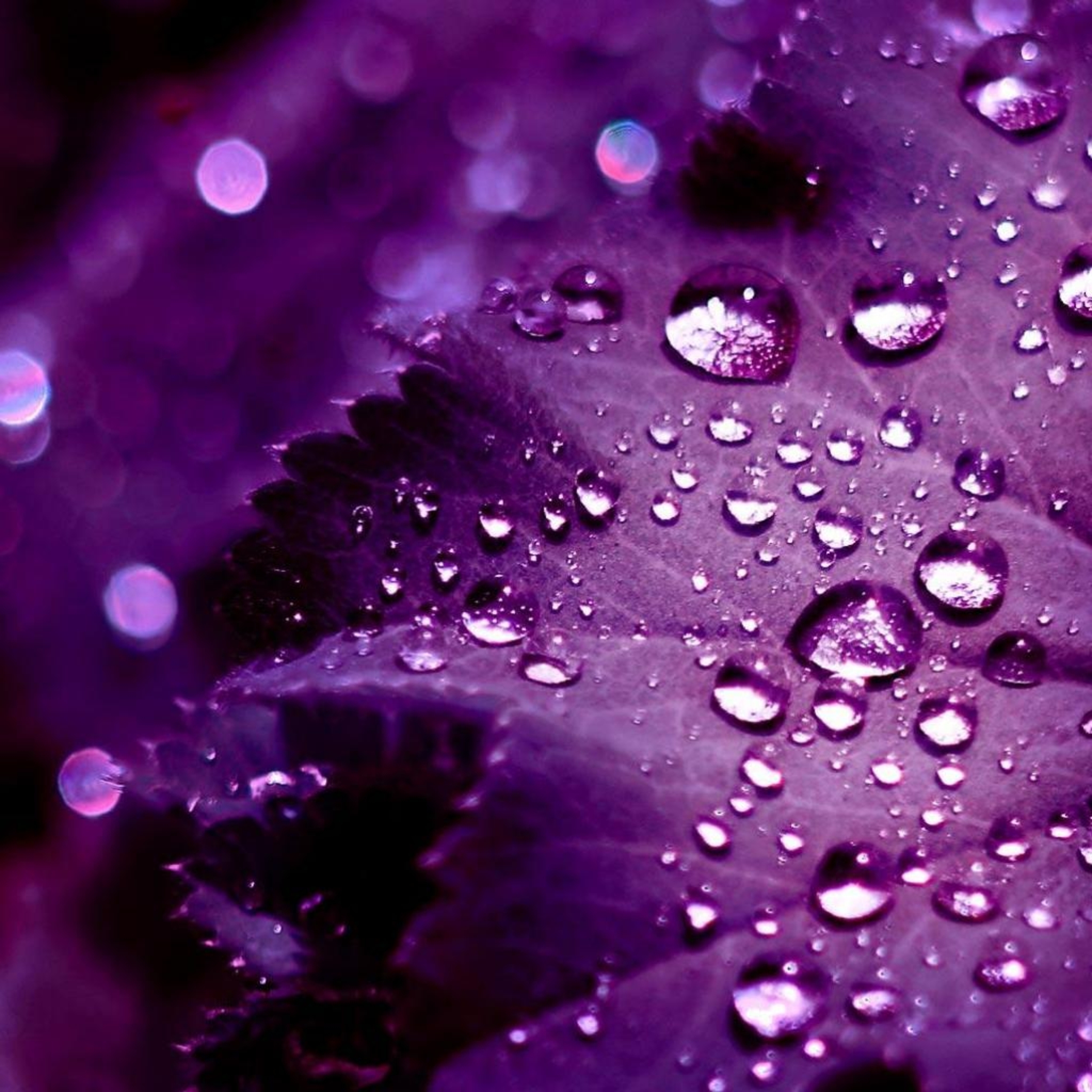 Description: A purple flower with water droplets on it's petals and leaves in the background.