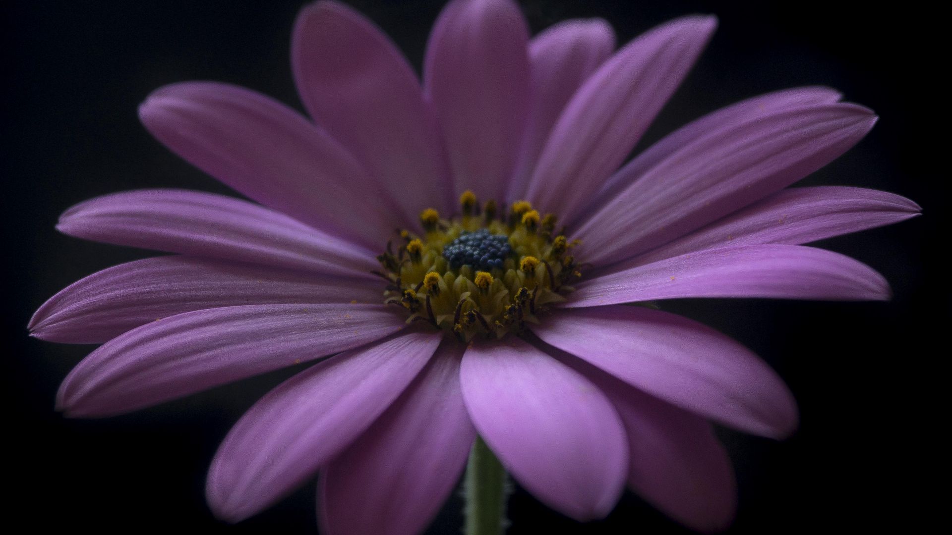 Description: A purple flower with a yellow center on a black background with a black background behind it and a yellow center on the center of the flower.