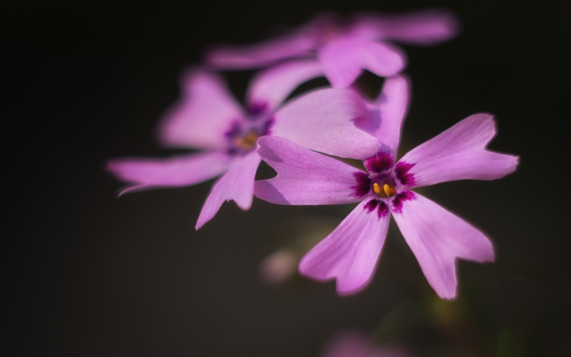 Description: A close up of a purple flower with a black background behind it and a yellow center in the center.