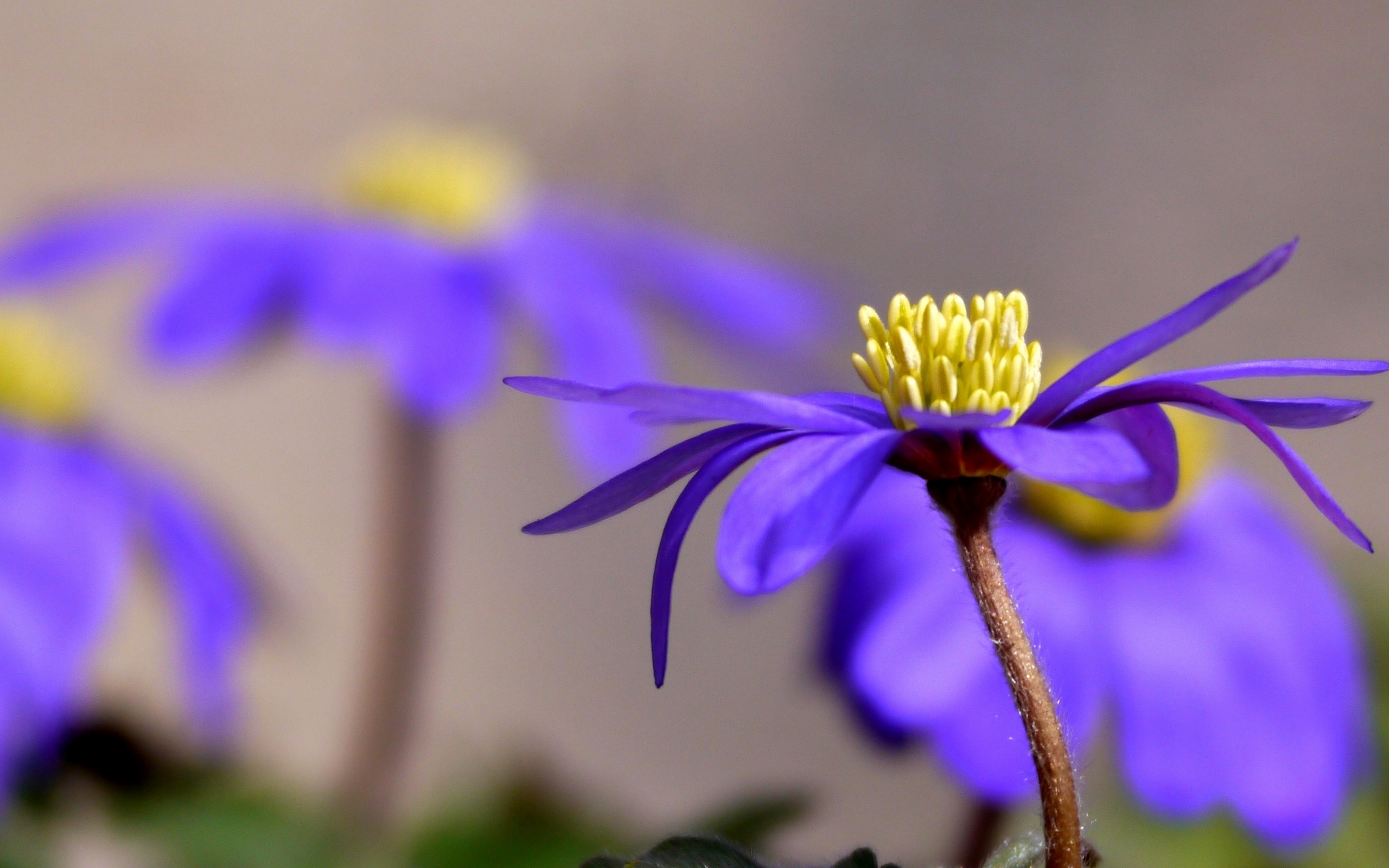 Description: A close up of a purple flower with yellow stamens in the center of the flower stem and a gray background.