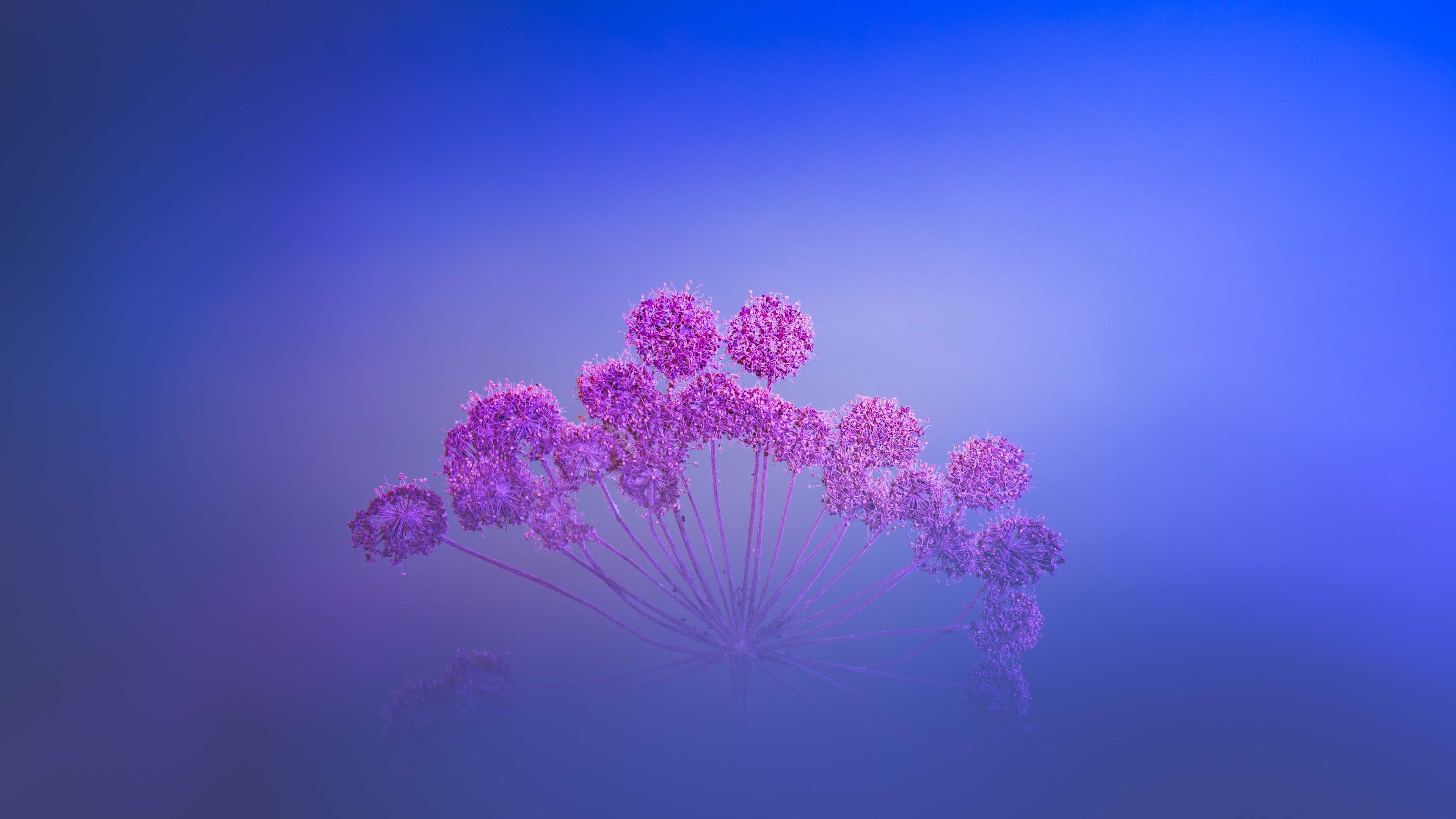 Description: A bunch of purple flowers on a blue background with a blurry background behind them and a blue sky.