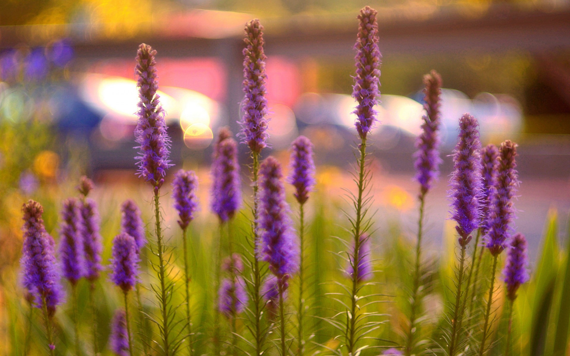 Description: A bunch of purple flowers in a field of grass and flowers in the foreground.