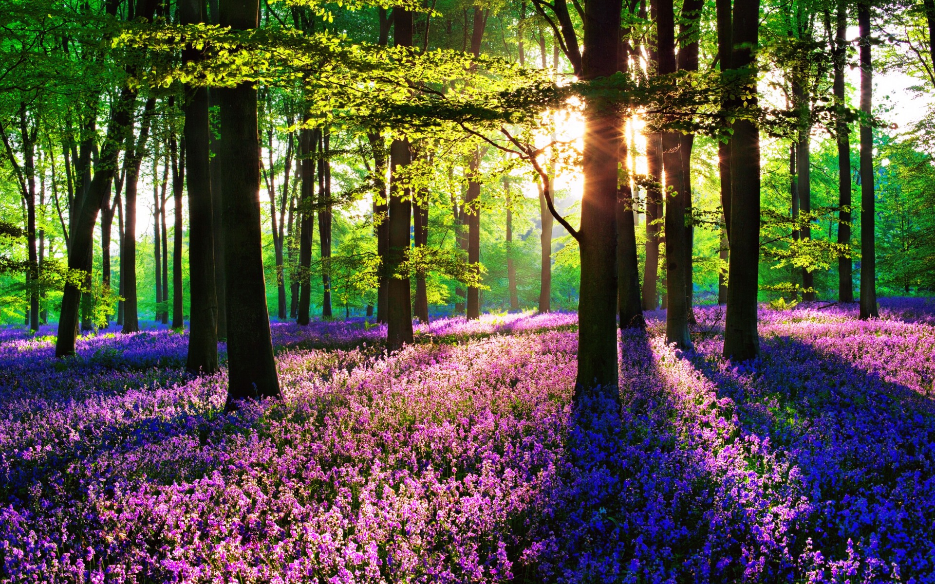 Description: A forest filled with lots of purple flowers and trees with the sun shining through the trees in the background.
