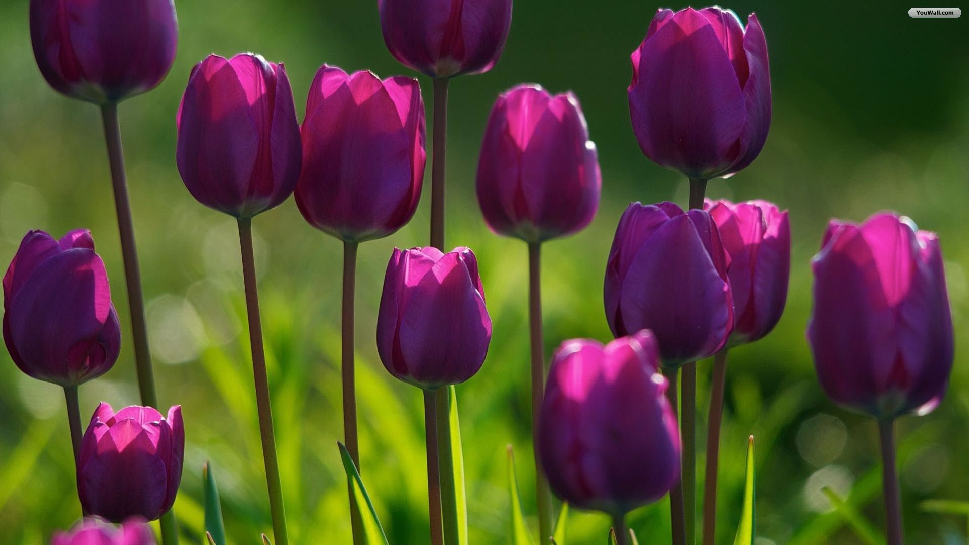 Description: A bunch of purple flowers are in the grass with a blurry background of green grass and a blurry background of pink tulips.