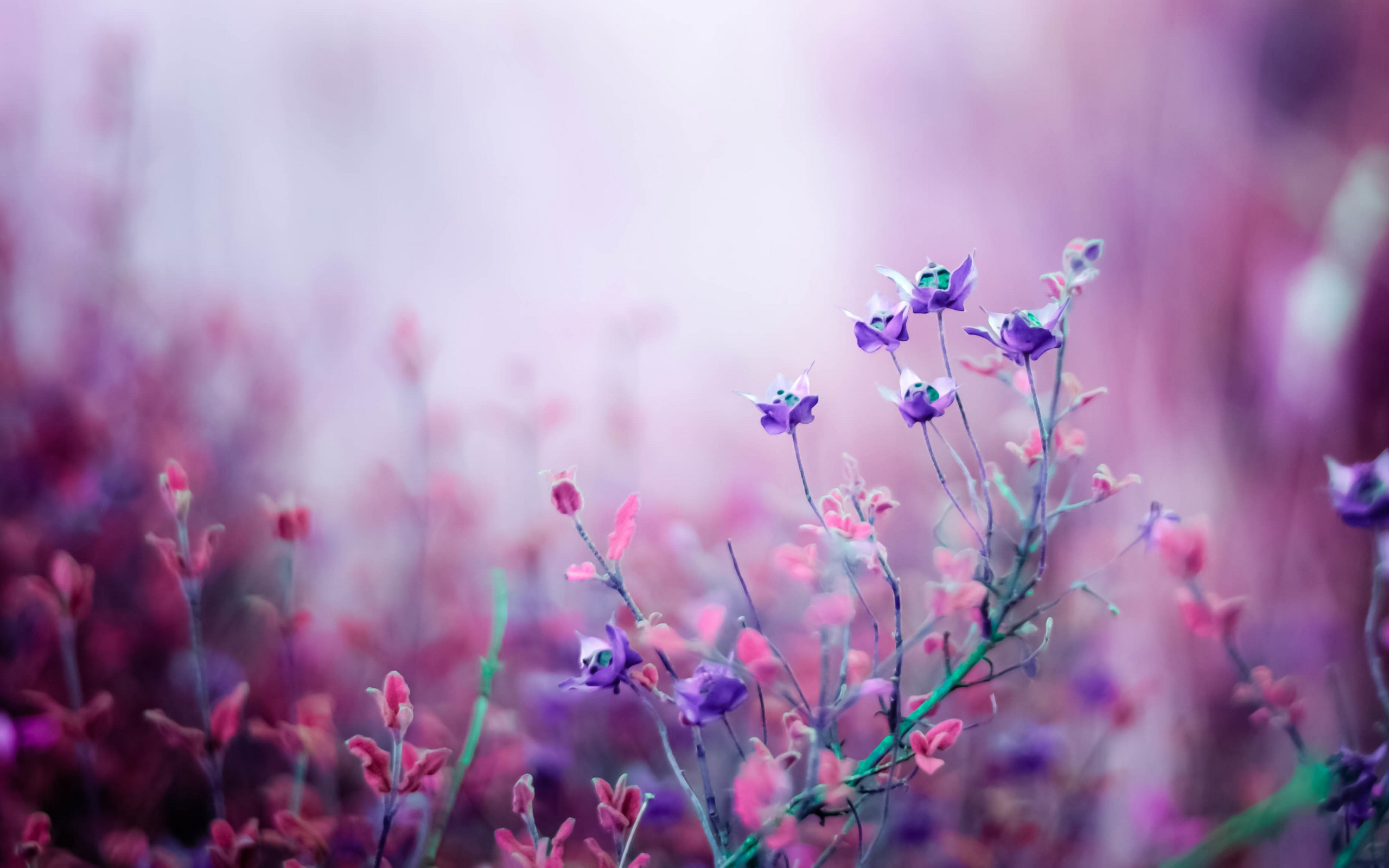 Description: A bunch of purple flowers that are in the grass with a blurry background of purple flowers in the grass.
