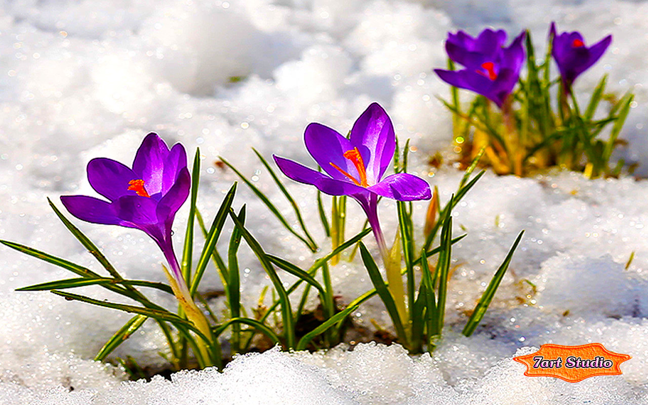 Description: Purple flowers are growing out of the snow on the ground in the snow.