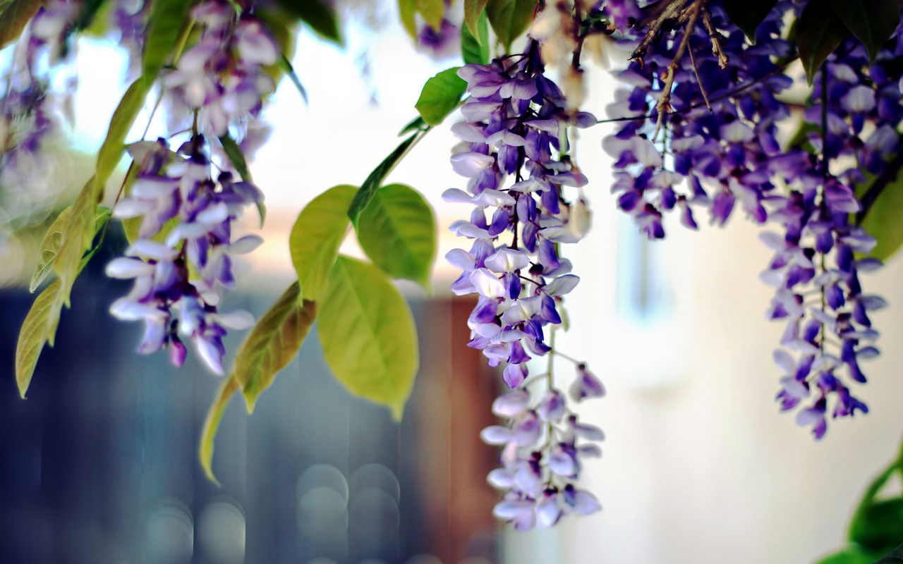 Description: A bunch of purple flowers hanging from a tree branch in a room with a window in the background and a blurry wall behind it.
