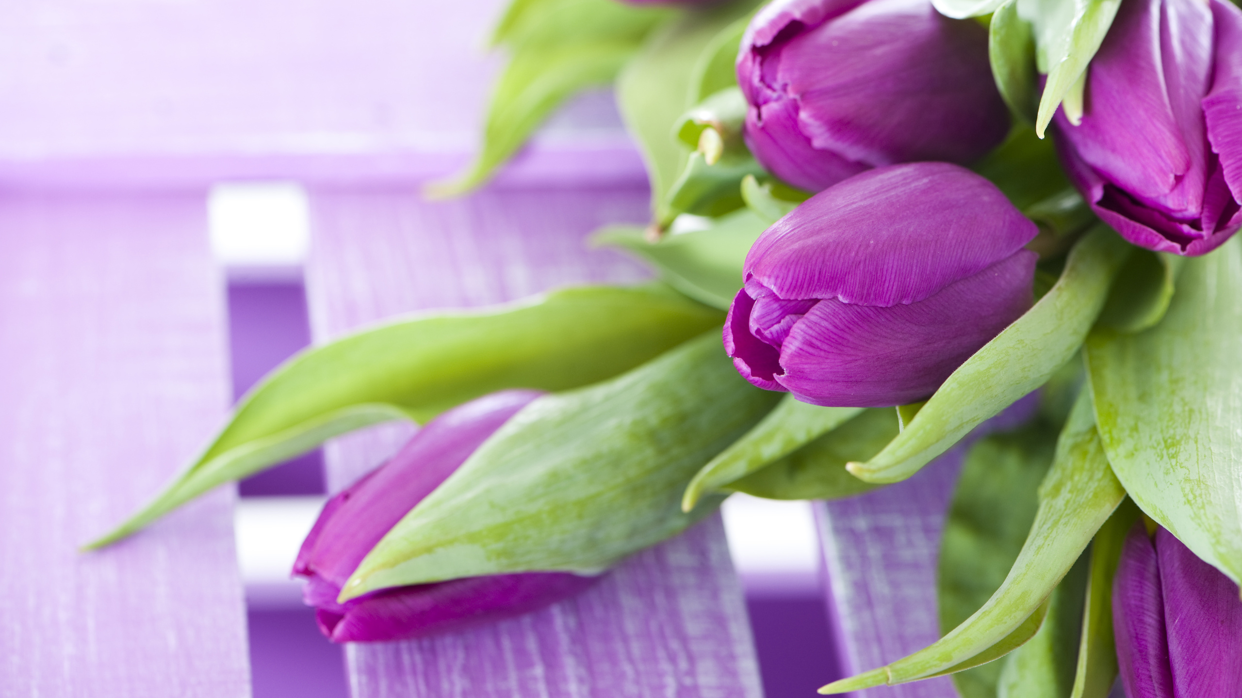 Description: A bunch of purple flowers sitting on top of a table next to each other on a purple surface with a white stripe.
