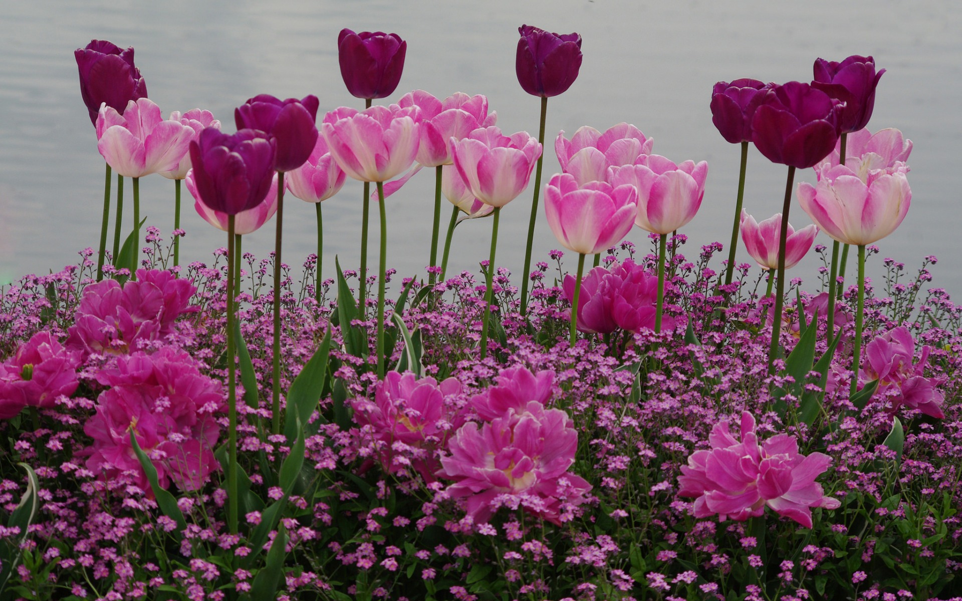 Description: A field of purple and pink flowers next to a body of water with a bird flying over it and a bunch of purple flowers.
