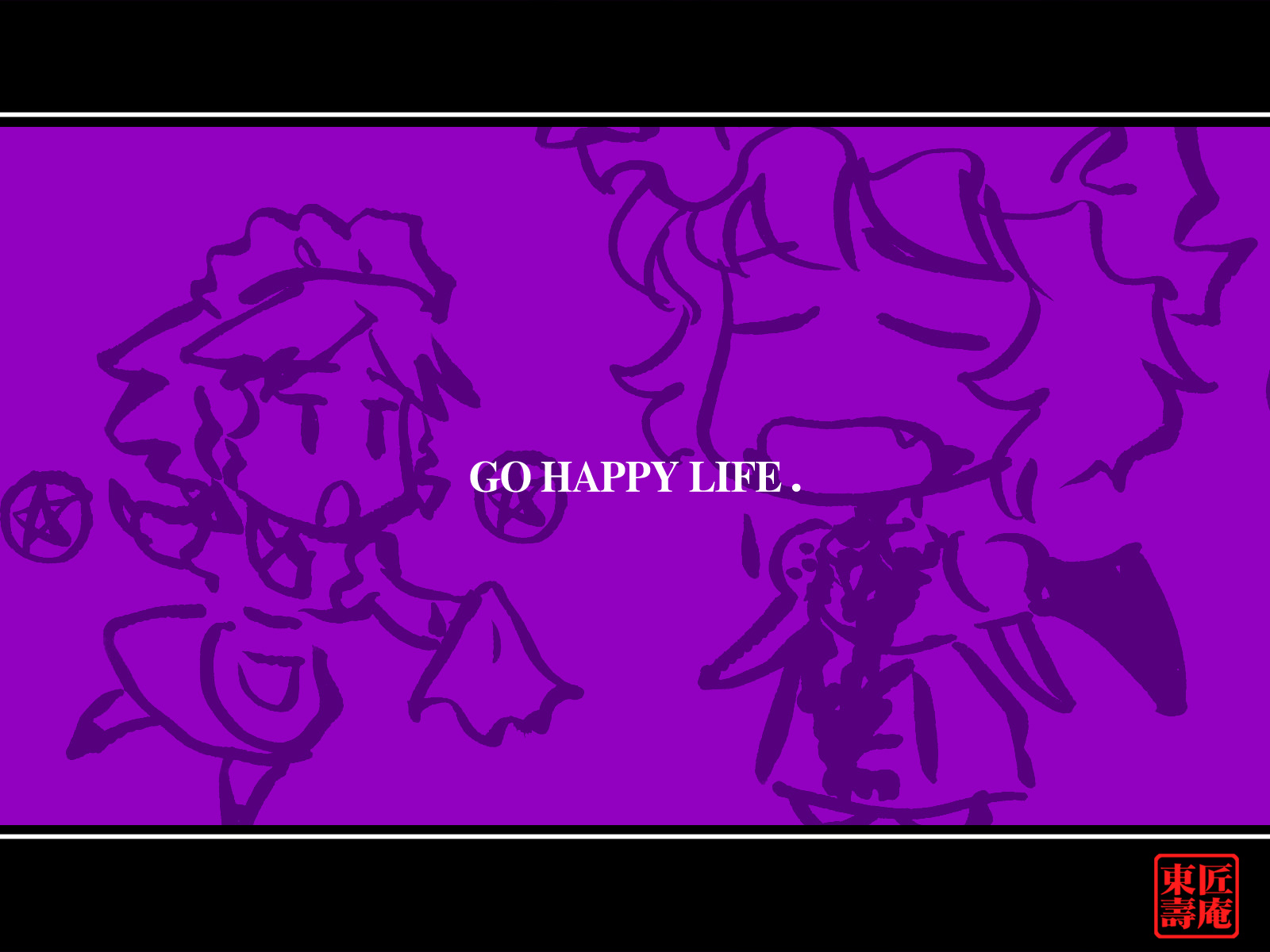 Description: A purple background with a drawing of a girl and a man with a trumpet and a sign that says go happy life.
