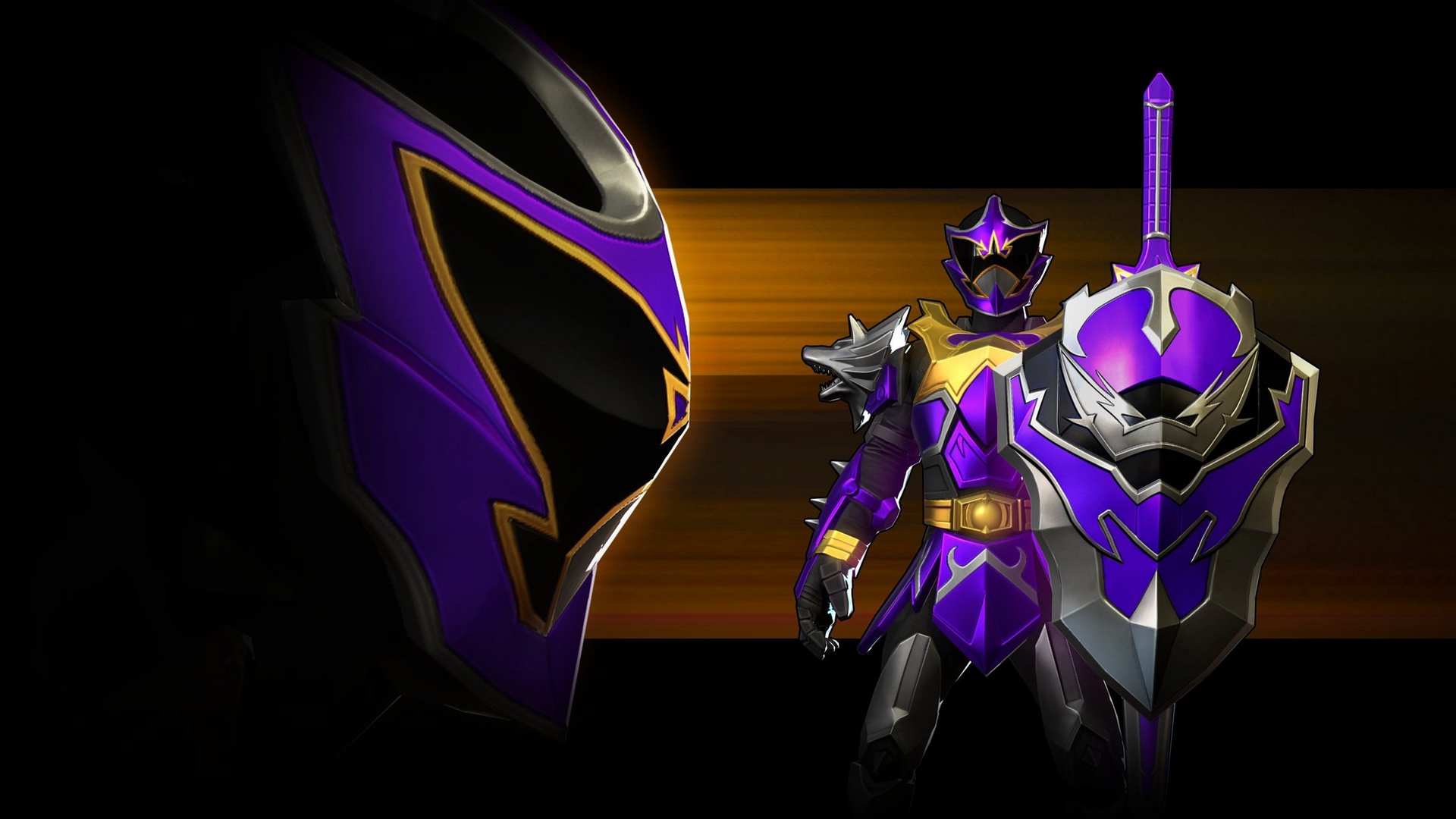 Description: A purple and gold suit with a sword in it's hand and a black background with a yellow stripe.