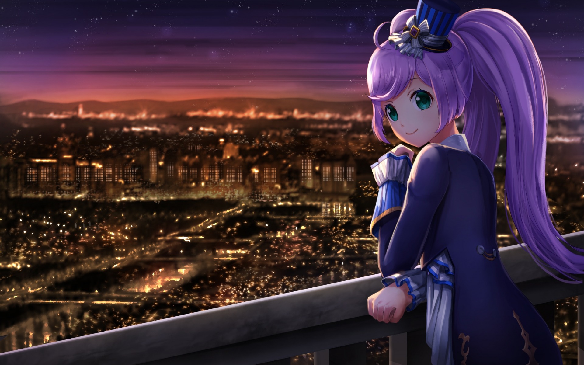 Description: A girl with purple hair standing on a balcony overlooking a city at night with lights on the buildings and a city in the distance.