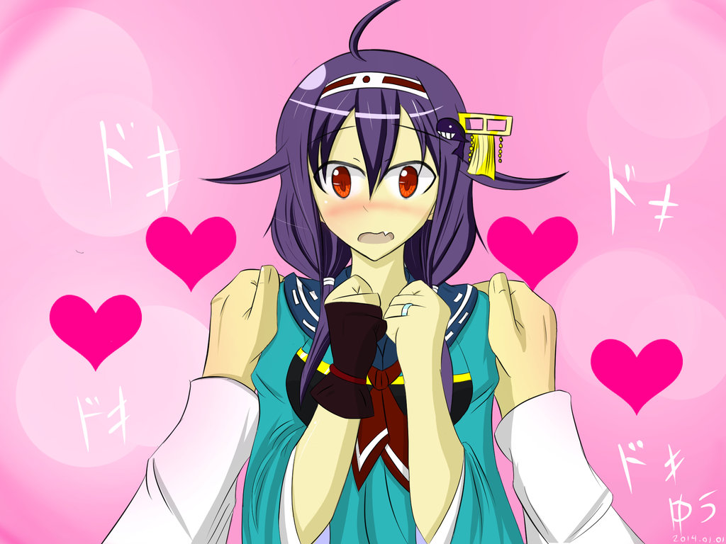 Description: A girl with purple hair and a blue dress holding a cell phone in her hands and a pink background with hearts.