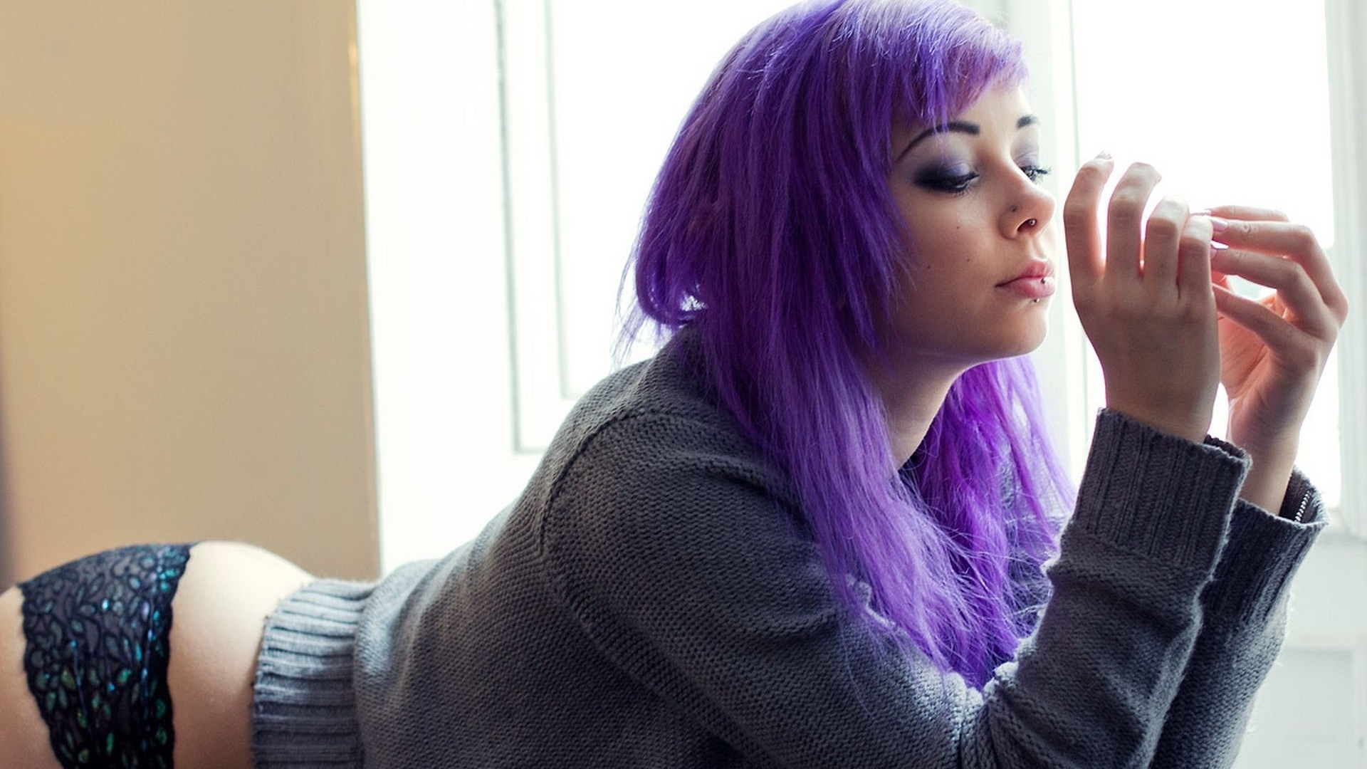 Description: A woman with purple hair is sitting on a couch and looking out the window with her eyes closed and her hand on her hip.