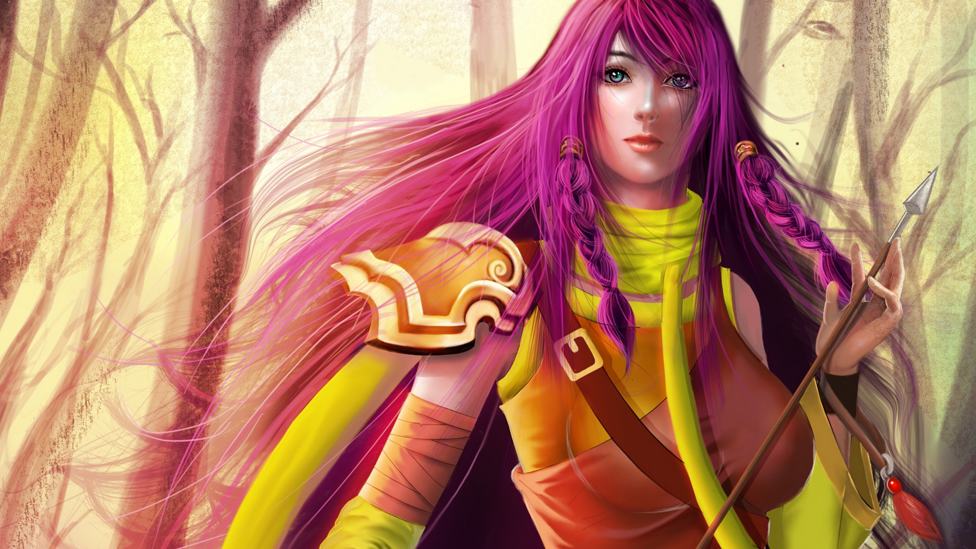 Description: A woman with purple hair holding a knife and a golden key in her hand in a forest with trees.