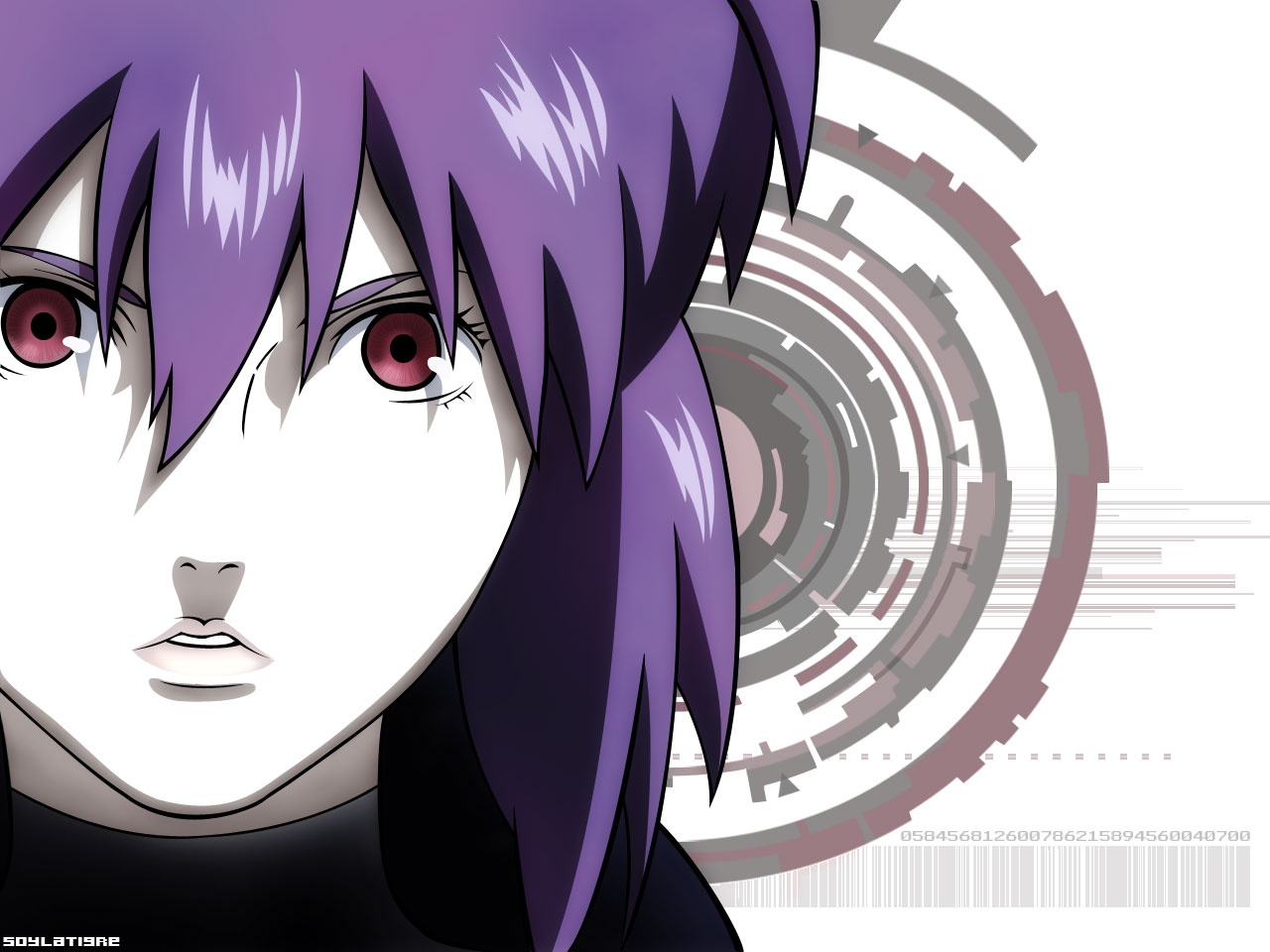 Description: A anime character with purple hair and red eyes looking at the camera with a futuristic background behind her and a circular design.