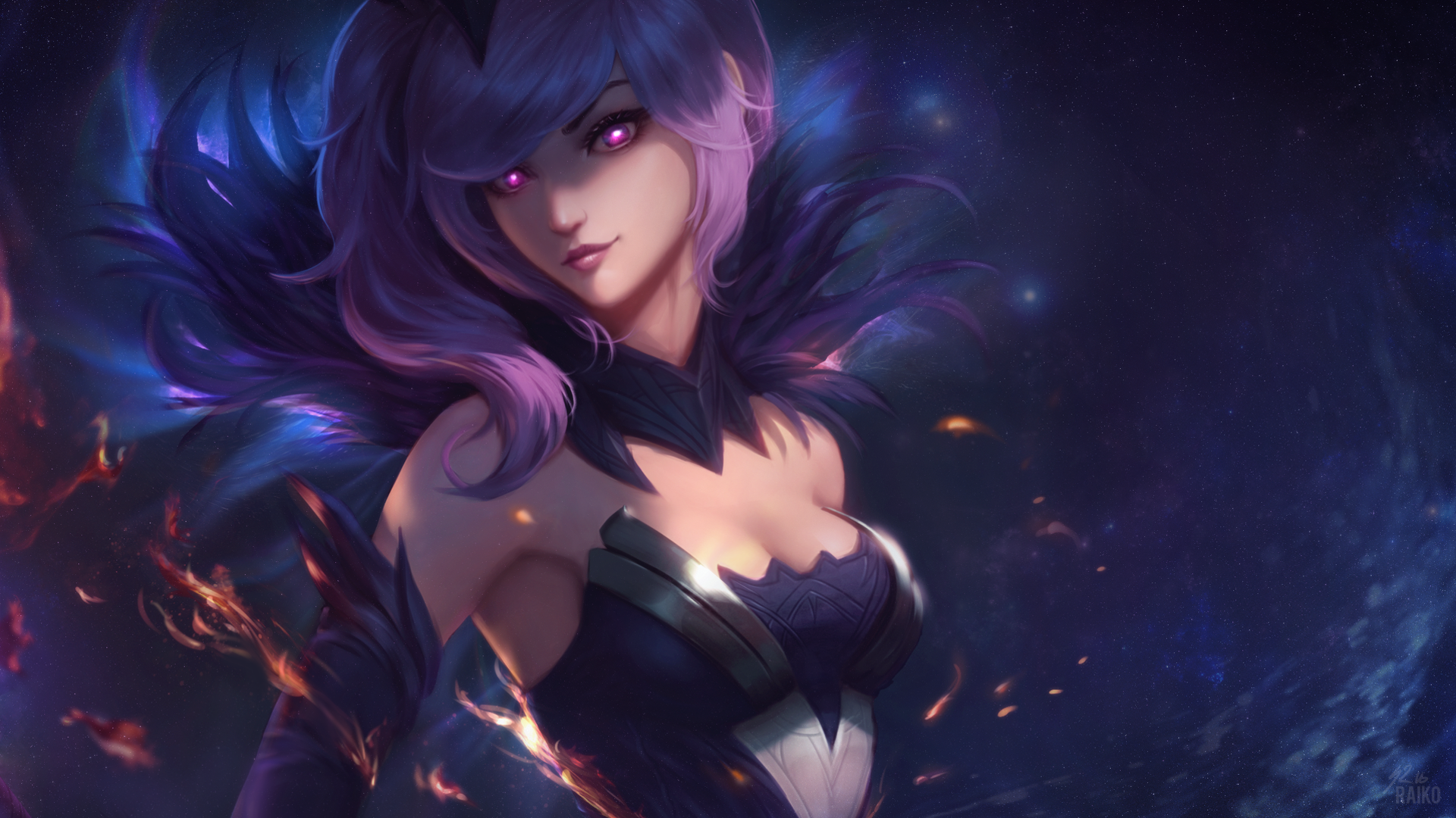 Description: A woman with purple hair and a black outfit with a sword in her hand and a blue background with stars.