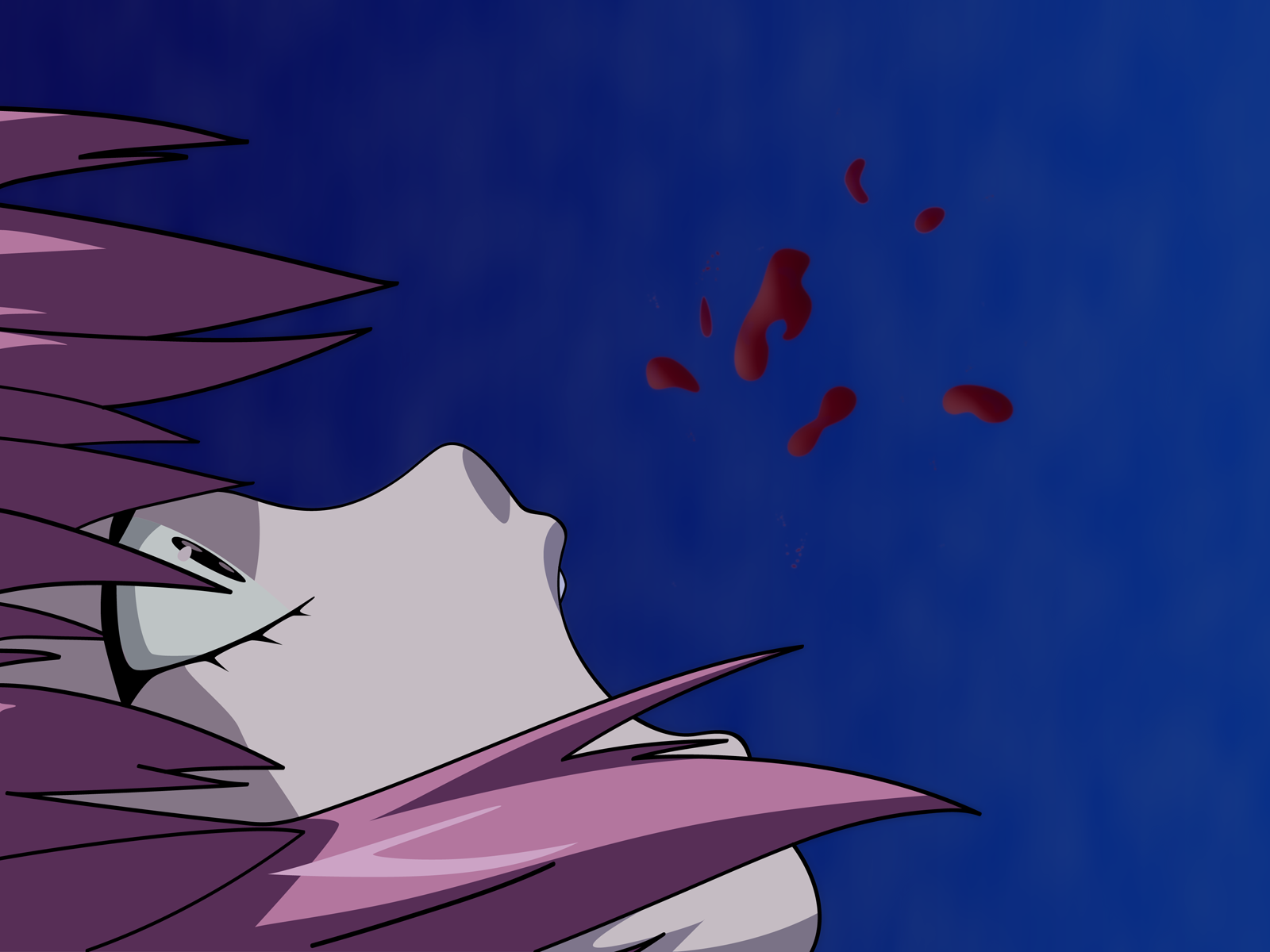 Description: A cartoon character with purple hair and a blue background with blood splatters on it's face.