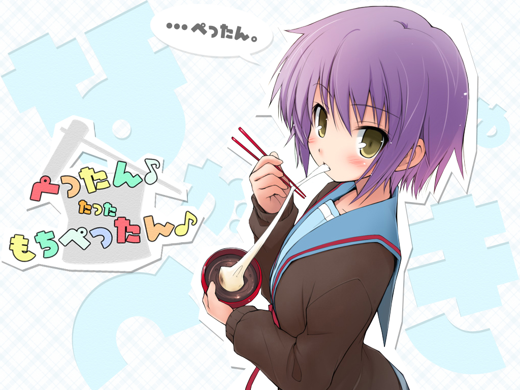 Description: A girl with purple hair holding chopsticks and a bowl of noodles in her hand and a speech bubble above her.