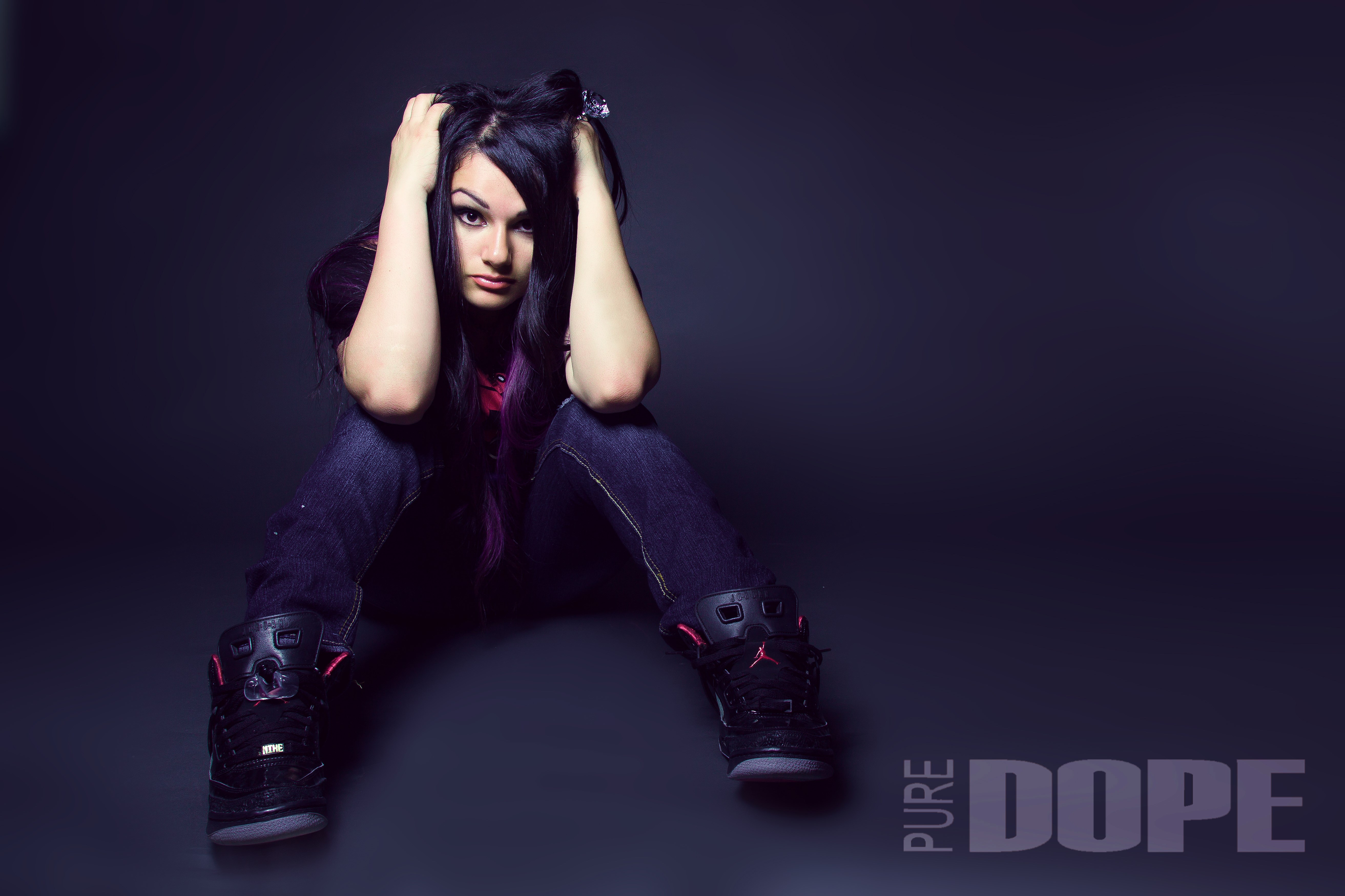 Description: A woman with purple hair sitting on the floor with her hands on her head and her legs crossed.