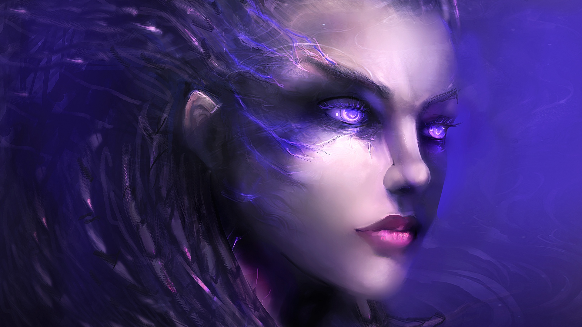 Description: A woman with blue eyes and purple hair with a purple background and a purple background with a black and white face.