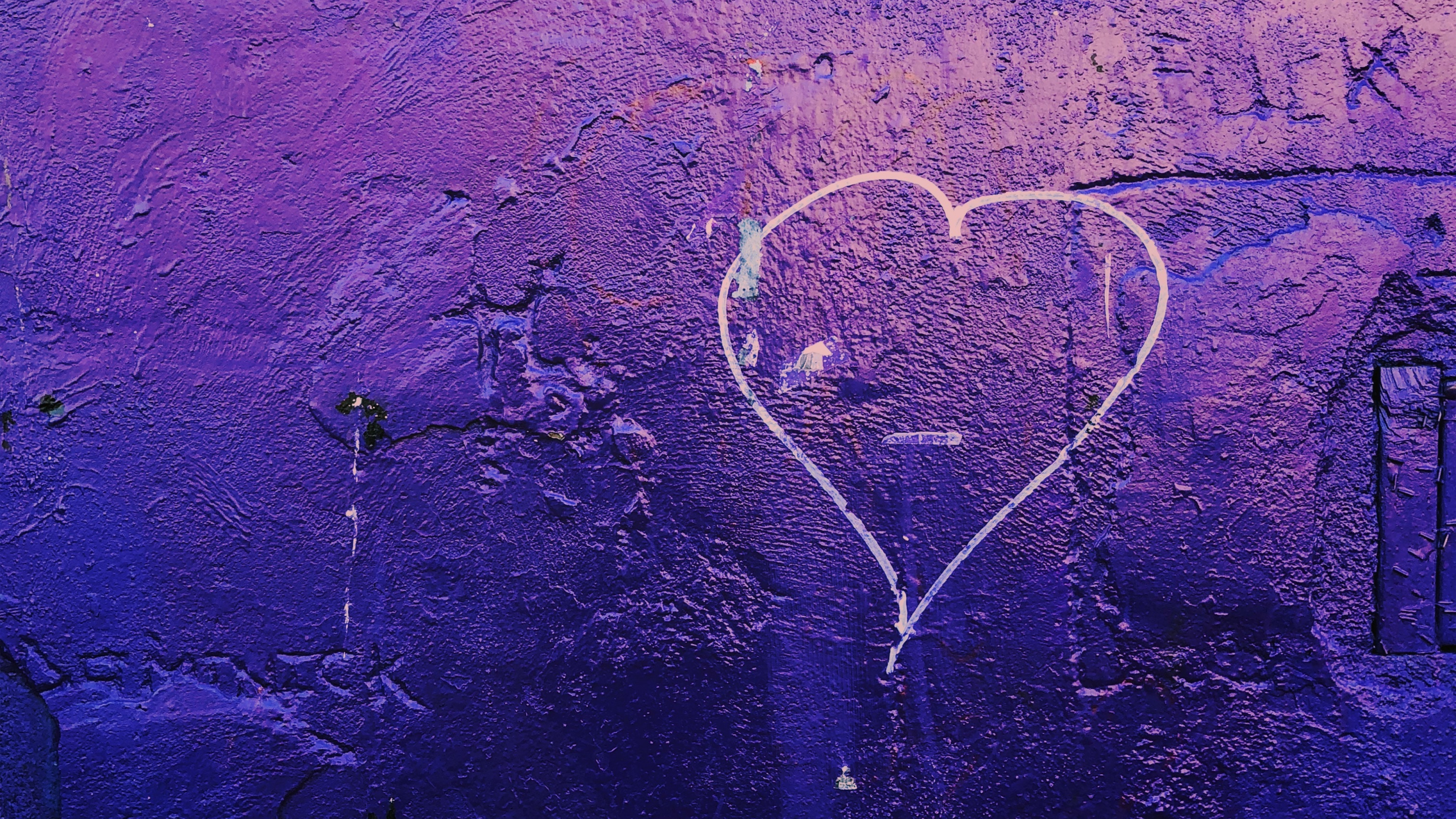 Description: A heart drawn on a purple wall with a lantern on it's side and a window in the background.