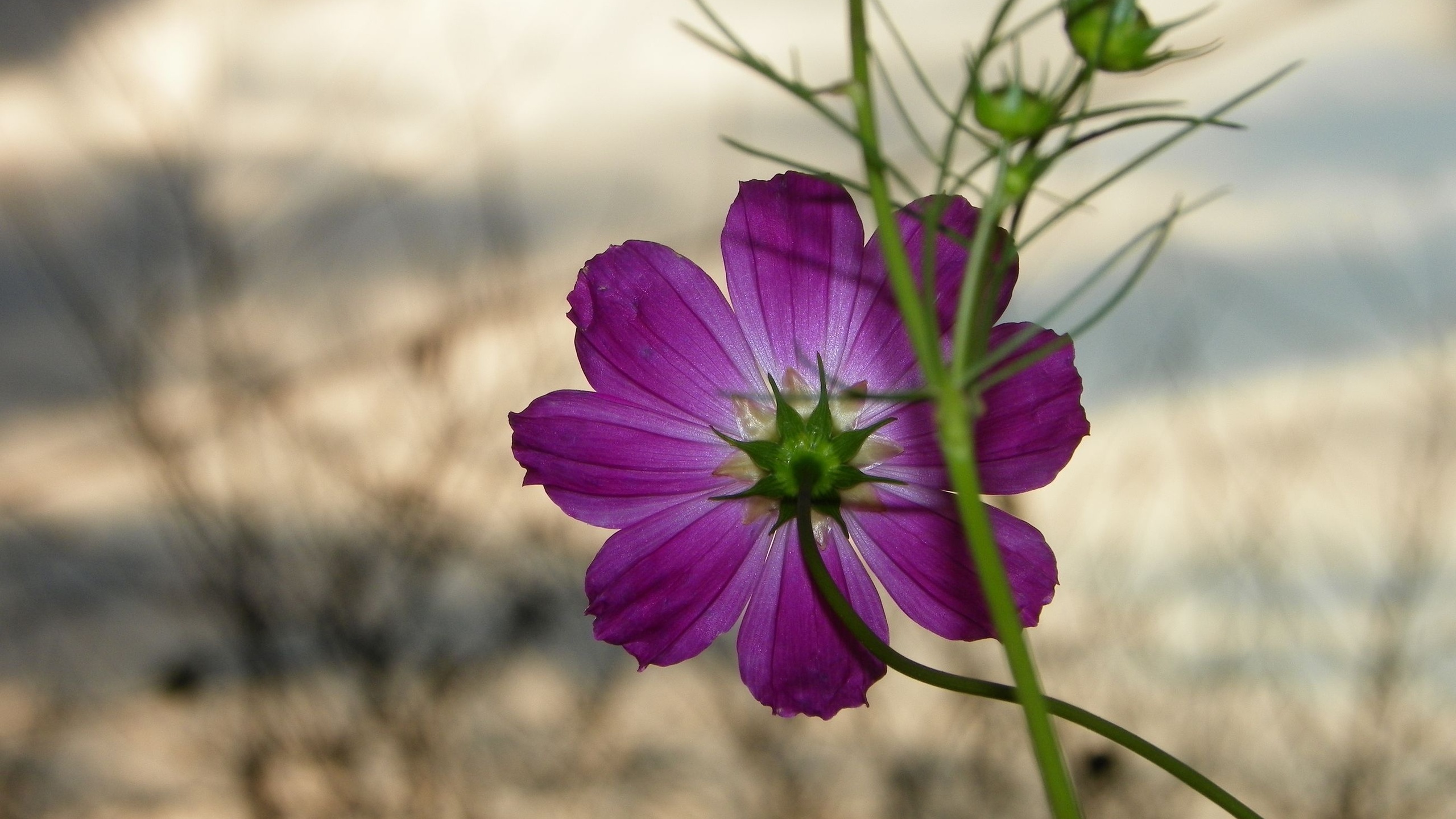 Description: A purple flower with a blurry background in the background is a blurry image of a tree and a building.