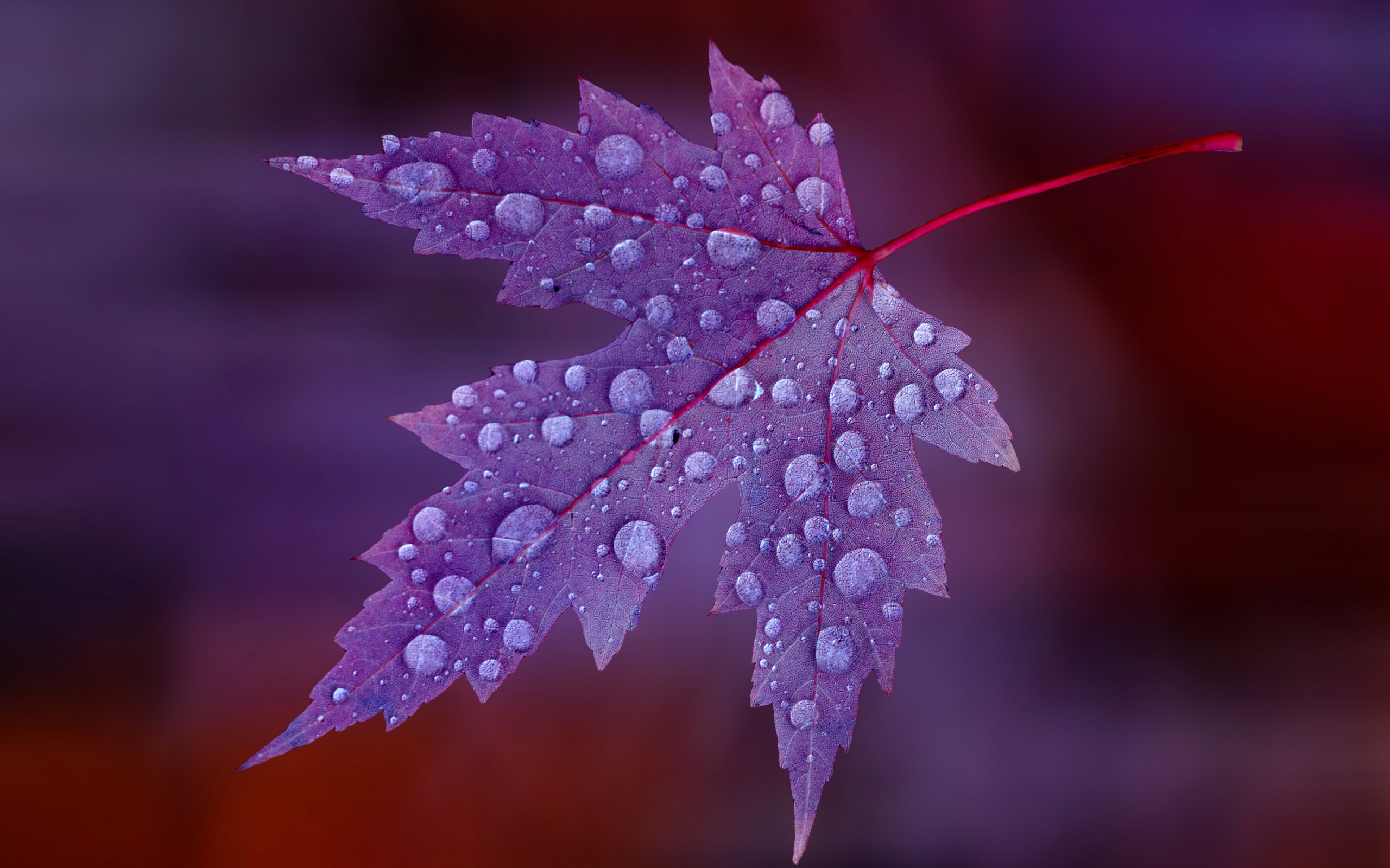 Description: A purple leaf with water droplets on it's leaves are shown in this image with a red background.