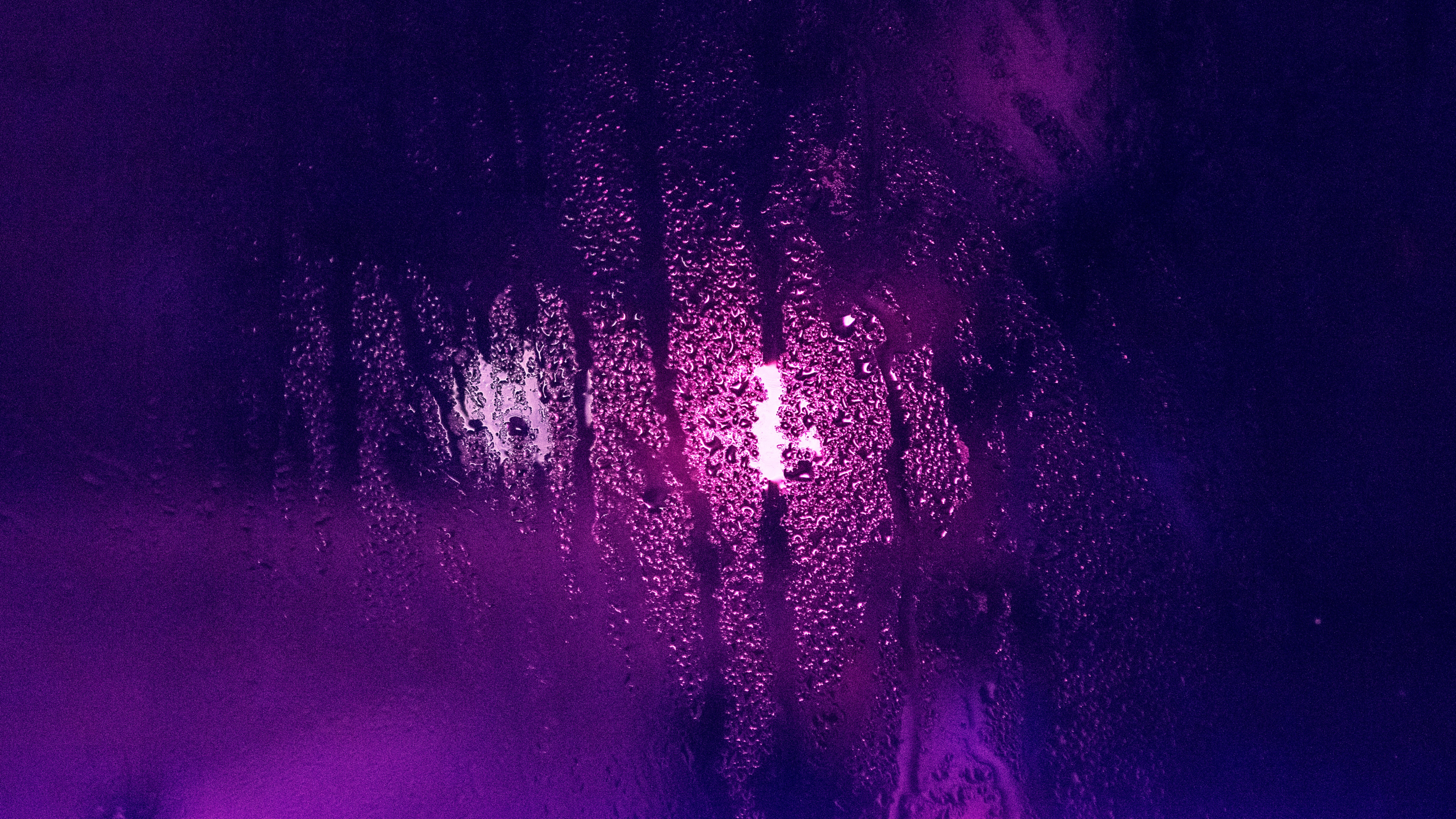 Description: A purple light shining through a window with rain drops on it and a cross on the window sill.