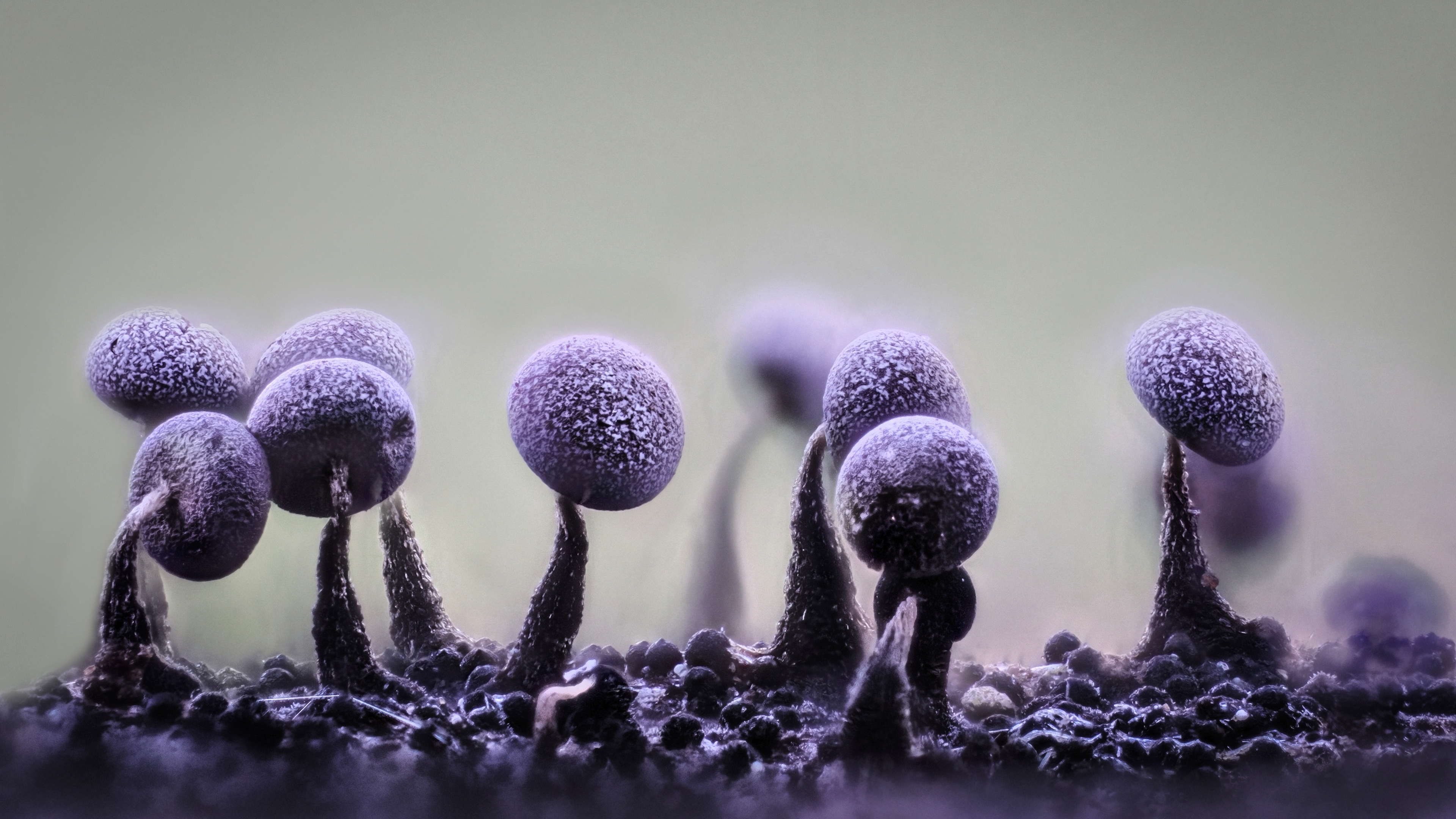 Description: A group of small purple mushrooms growing out of the ground in a field of grass and dirt.