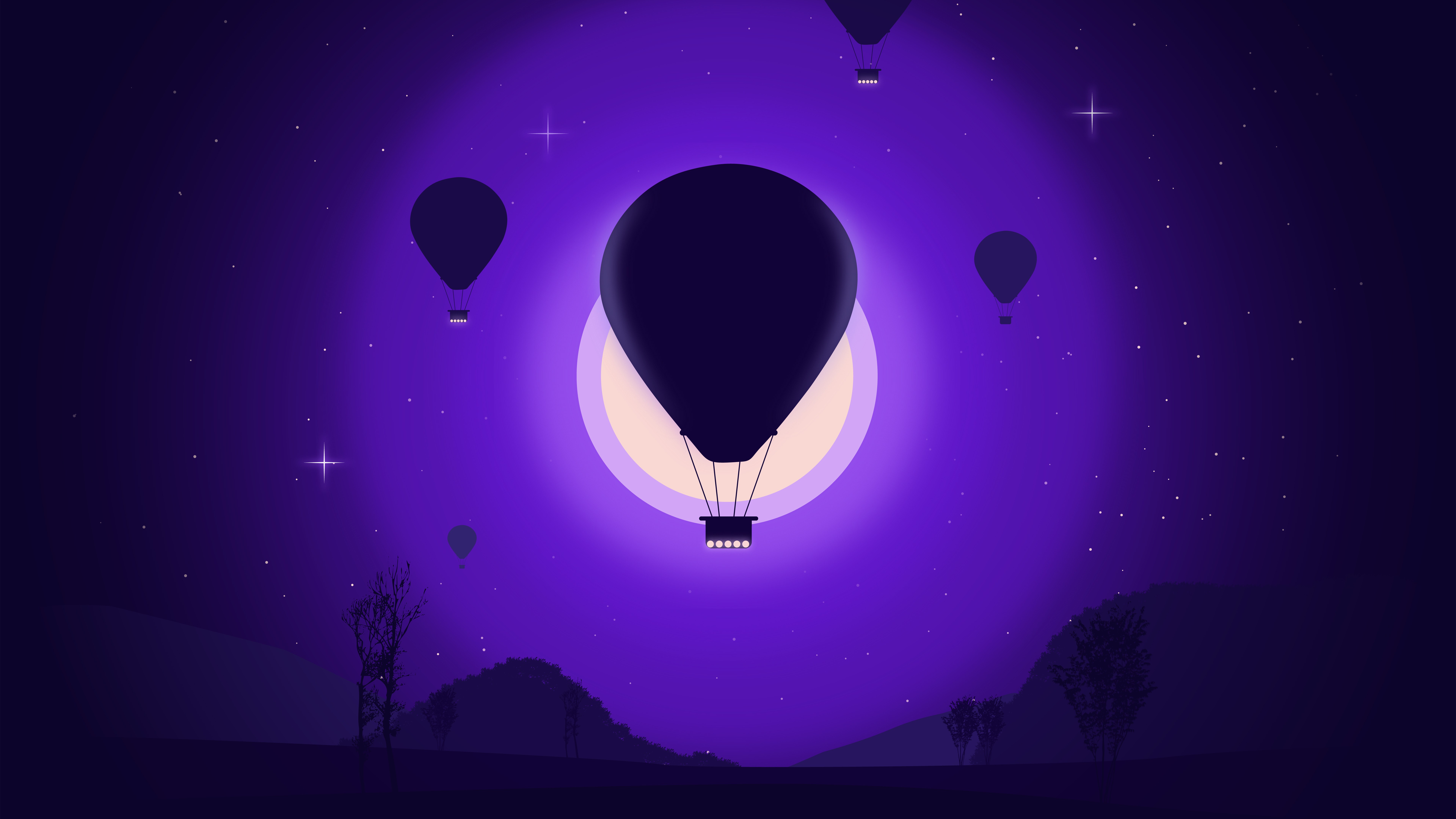 Description: A purple background with a hot air balloon flying in the sky at night with stars and moon in the sky.