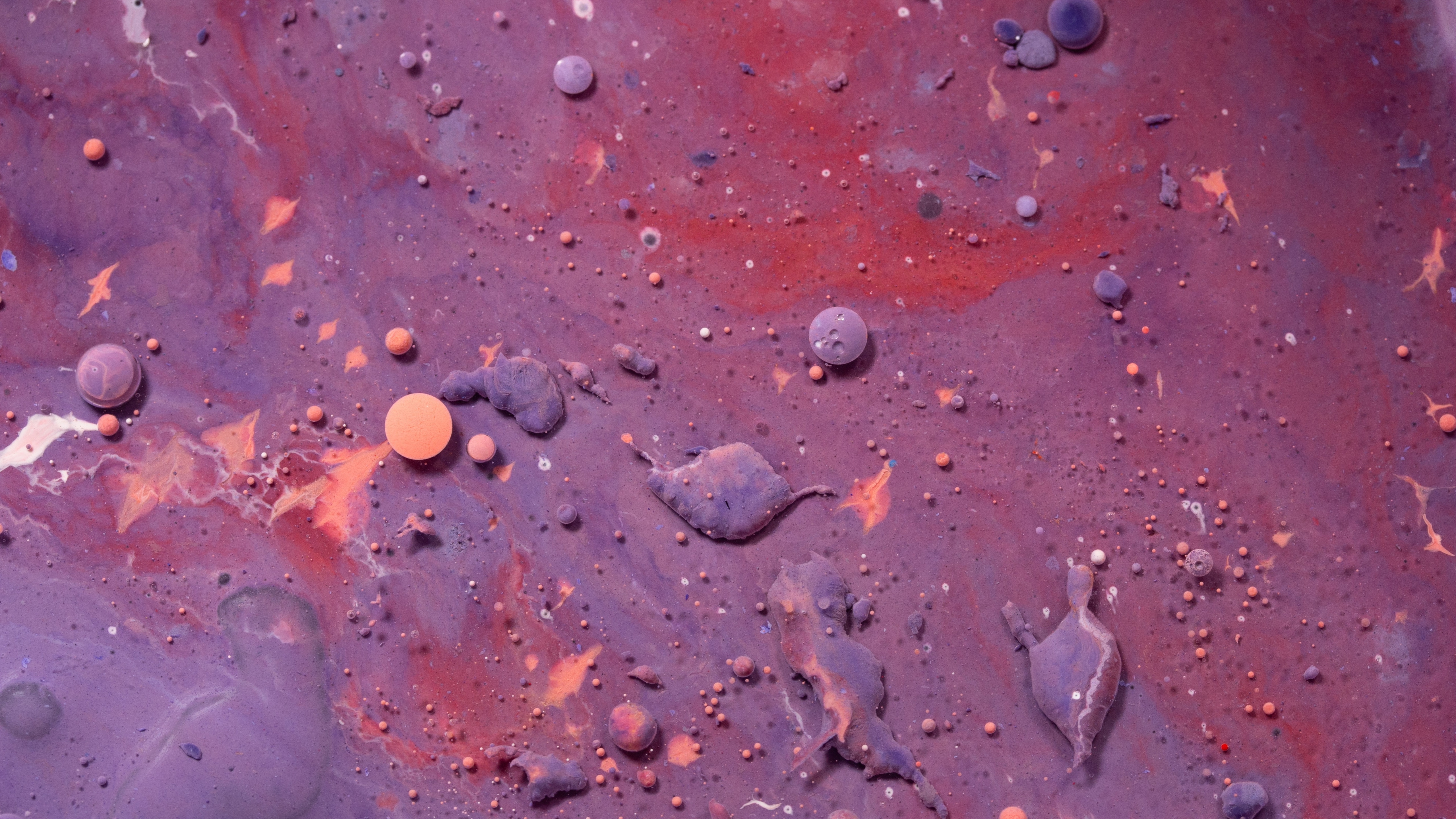 Description: A close up of a purple and orange substance with rocks and other things on it and a white object in the middle.