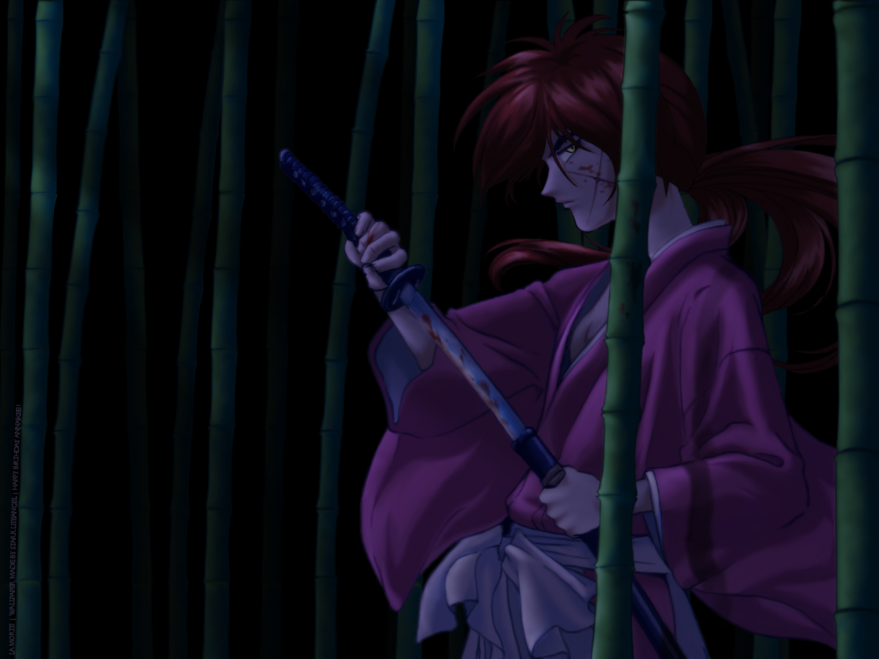 Description: A woman in a purple robe holding a sword in a forest of bamboo trees at night time with a dark background.