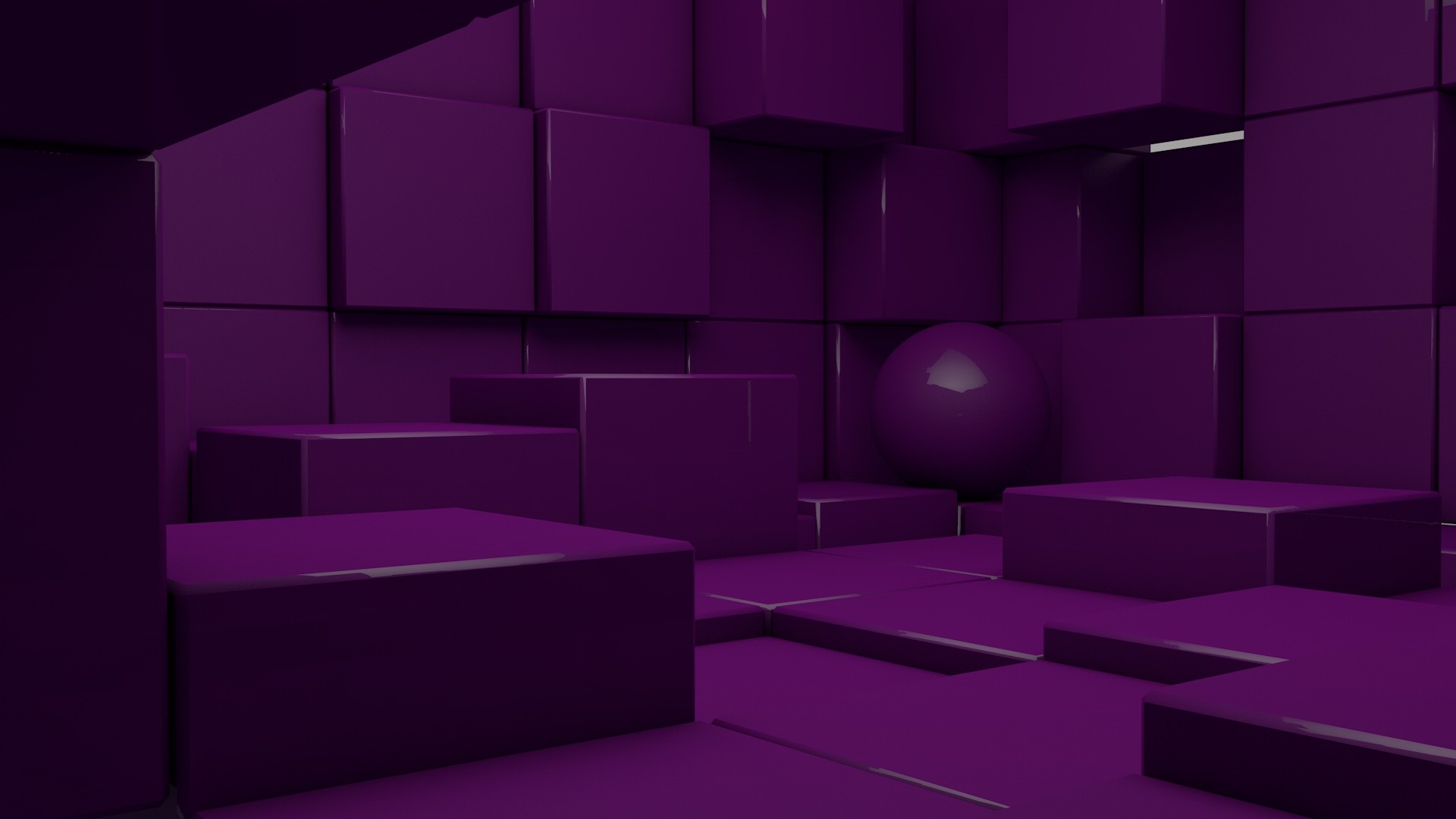 Description: A purple room with a purple ball and some boxes on the floor and a purple wall and floor area.