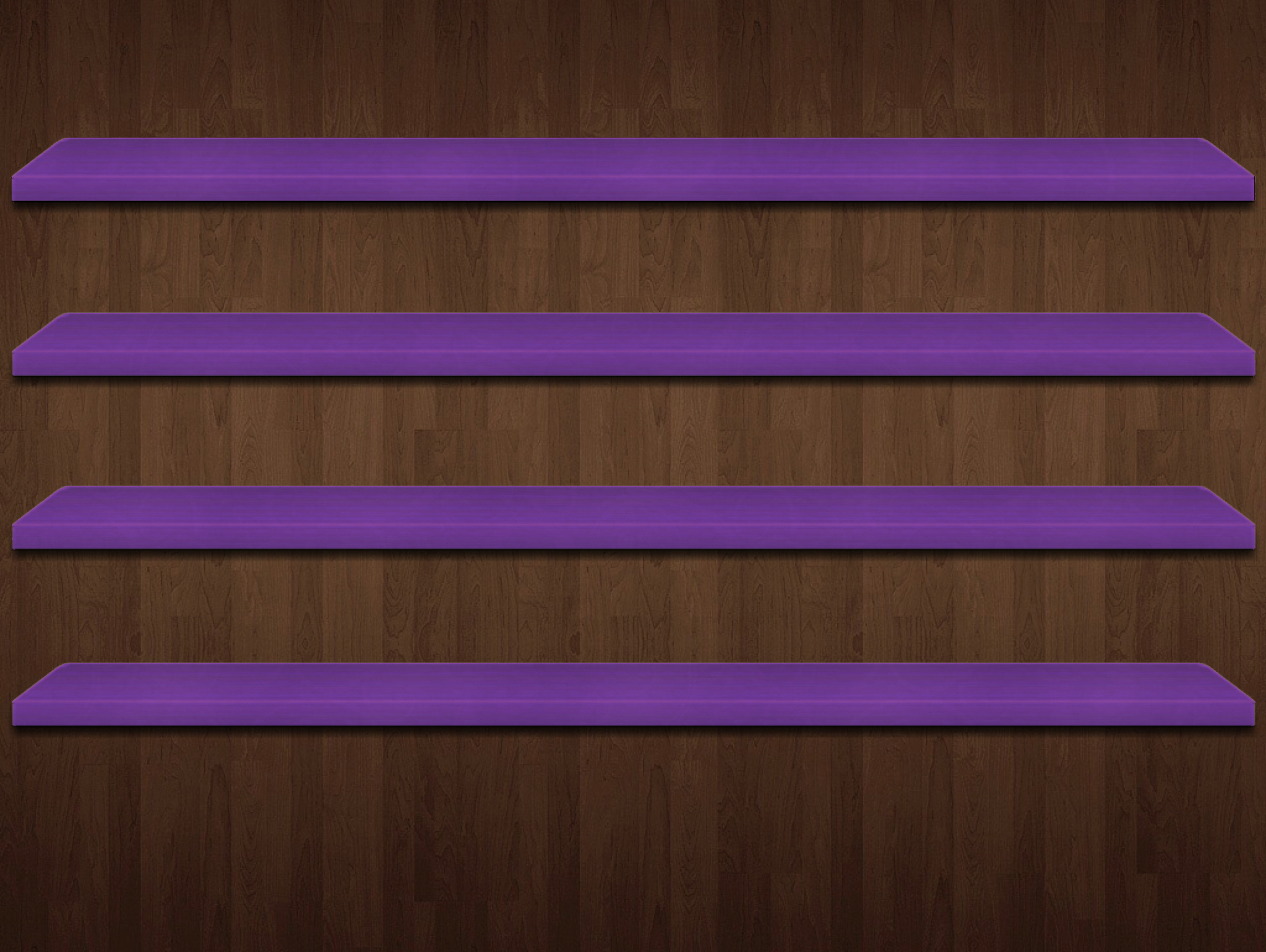 Description: A purple shelf sitting on top of a wooden floor next to a wall with a clock on it's side.