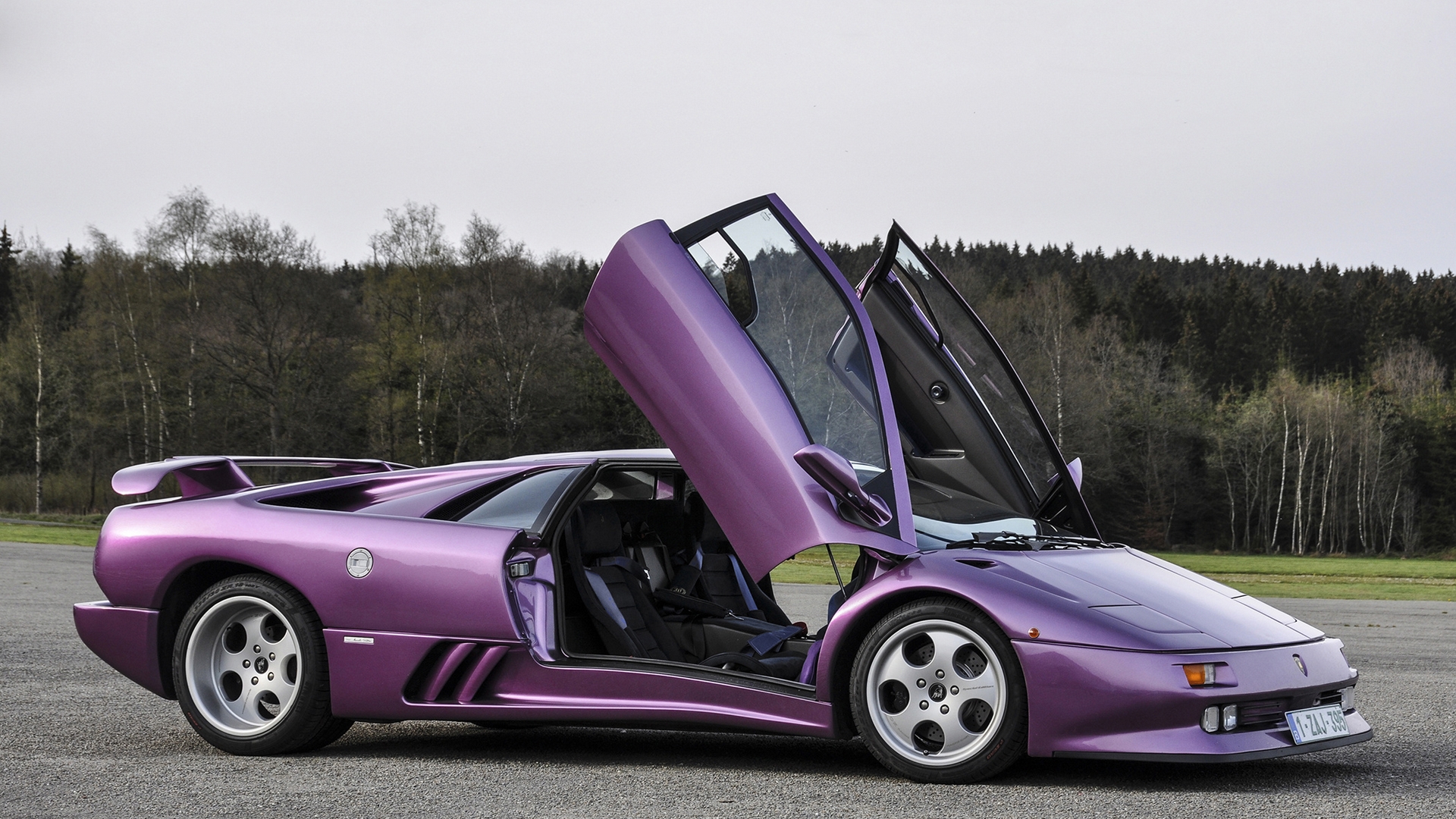 Description: A purple sports car with its doors open on a parking lot with trees in the background and a forest in the background.