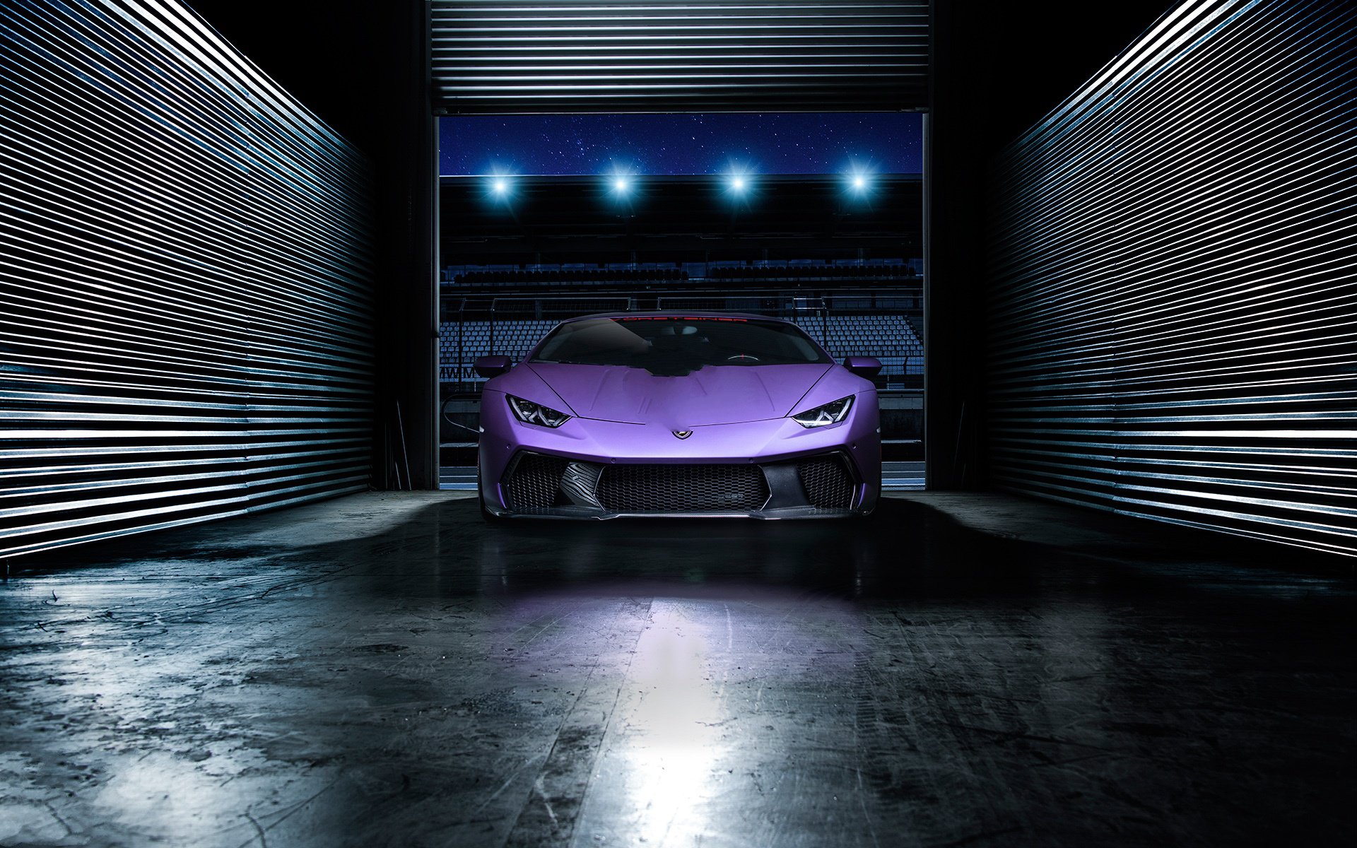 Description: A purple sports car parked in a tunnel of lights in a dark room with a black floor and walls.