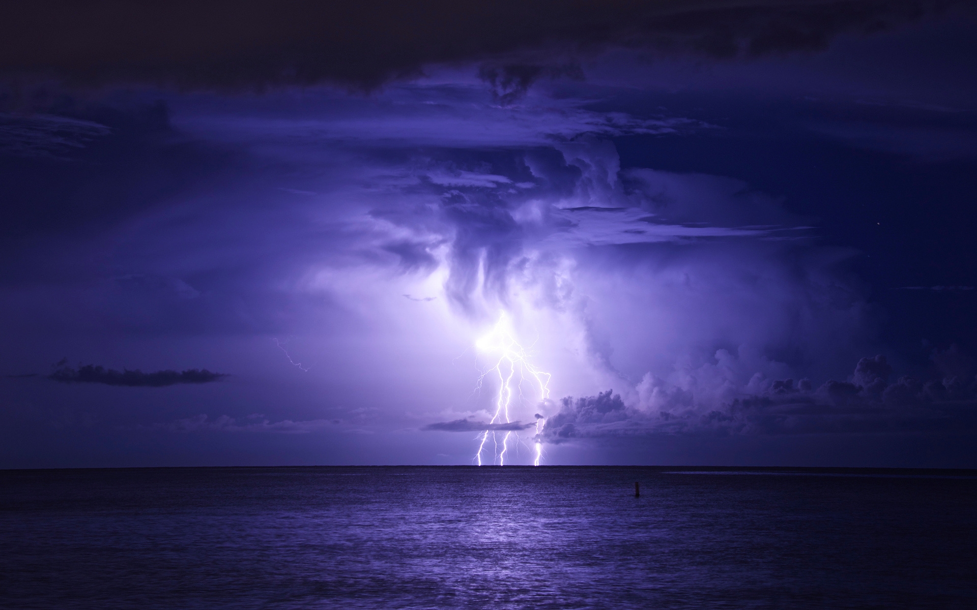 Description: A purple storm is coming over the ocean and a boat is in the water below it and a person is standing on the water.