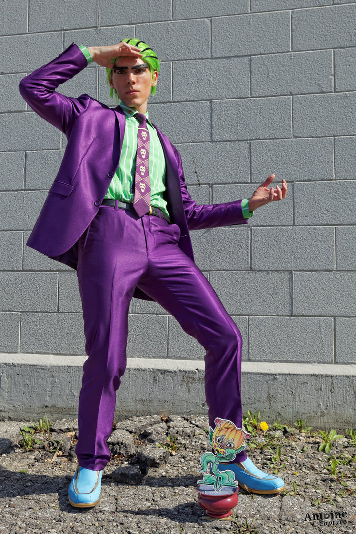 Description: A man in a purple suit and green tie standing next to a brick wall with his hands on his head.