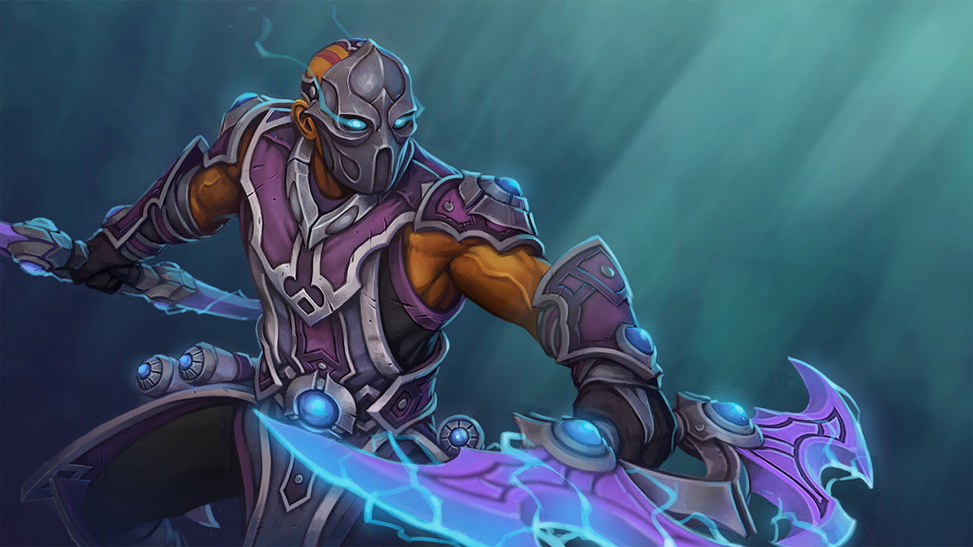 Description: A man in a purple suit holding a sword and a purple object in his hand with a blue light shining on his arm.