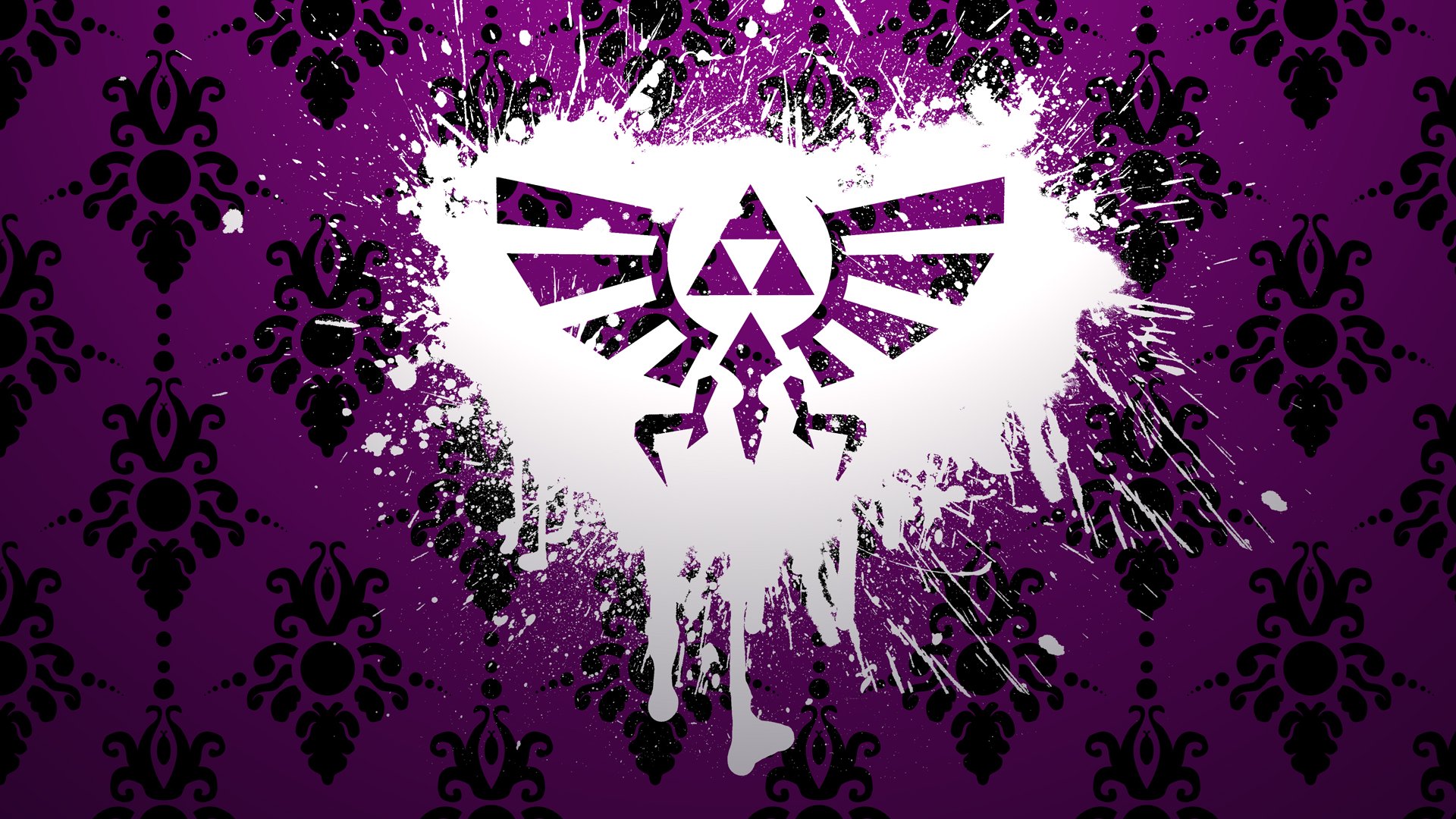 Description: A purple and white wallpaper with a zeldan symbol on it's side and a black and white background.