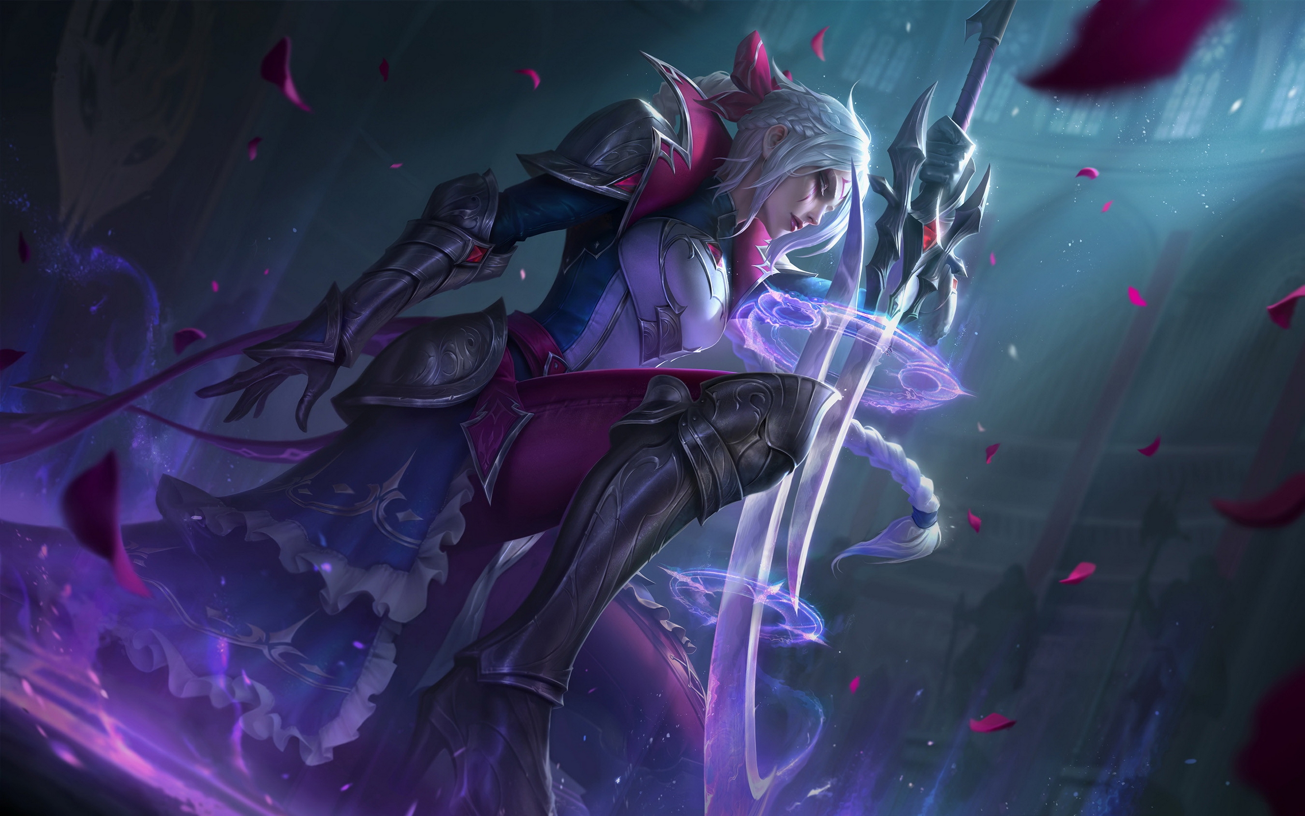 Description: A woman in a purple outfit holding a sword and a purple object in her hand with a purple background.