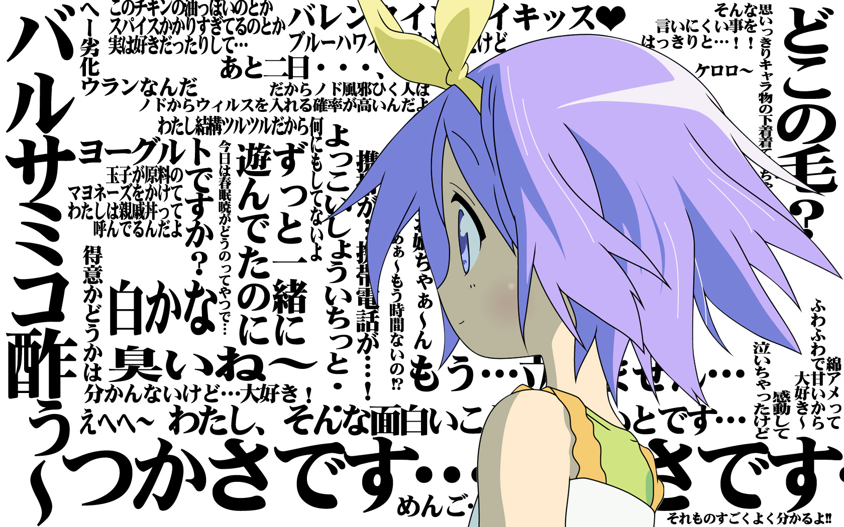 Description: A girl with purple hair and a green shirt with japanese characters around her and a white background with black letters.