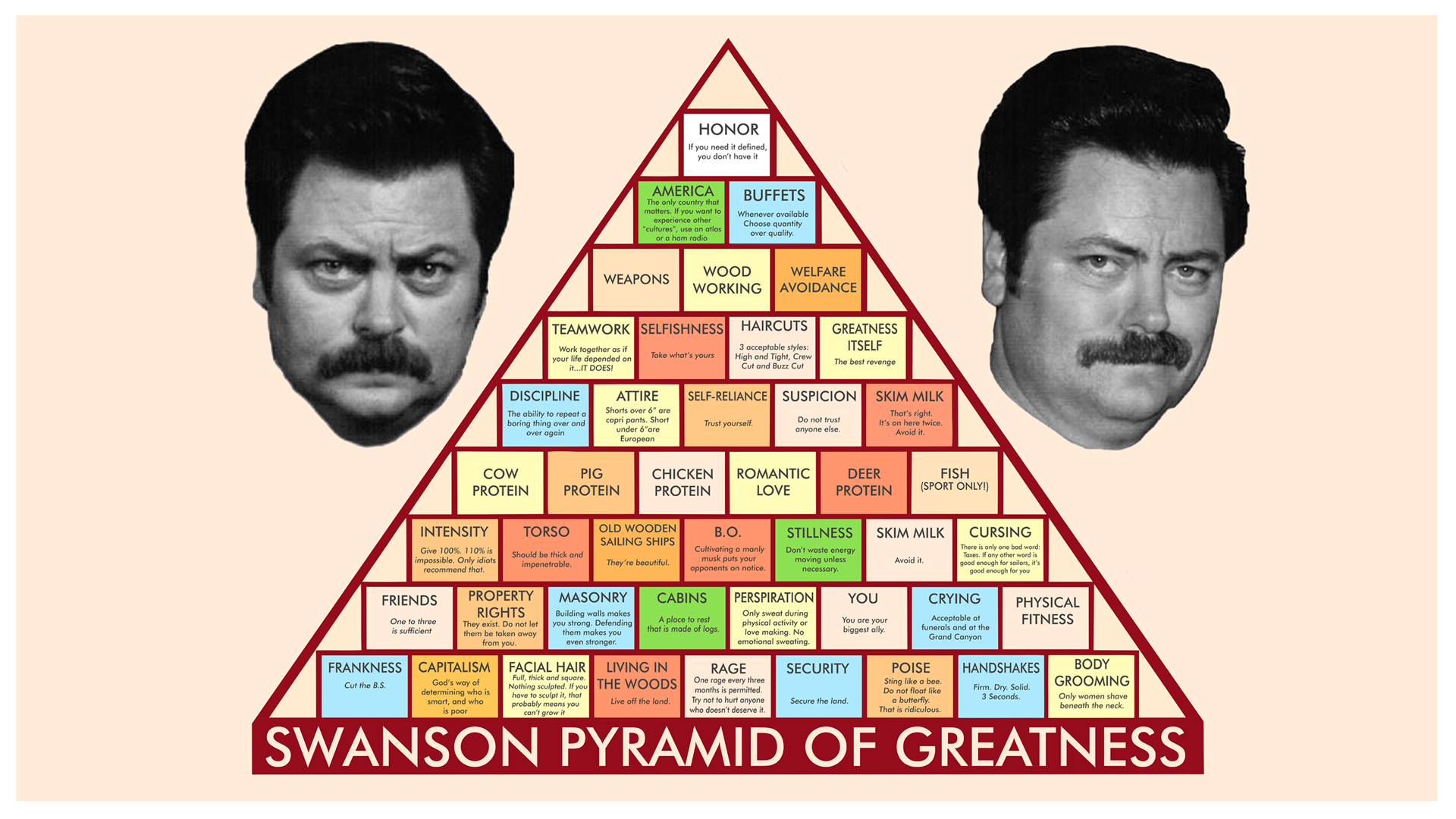Description: A pyramid with two men's heads and the words swanson pyramid of greatness on it.