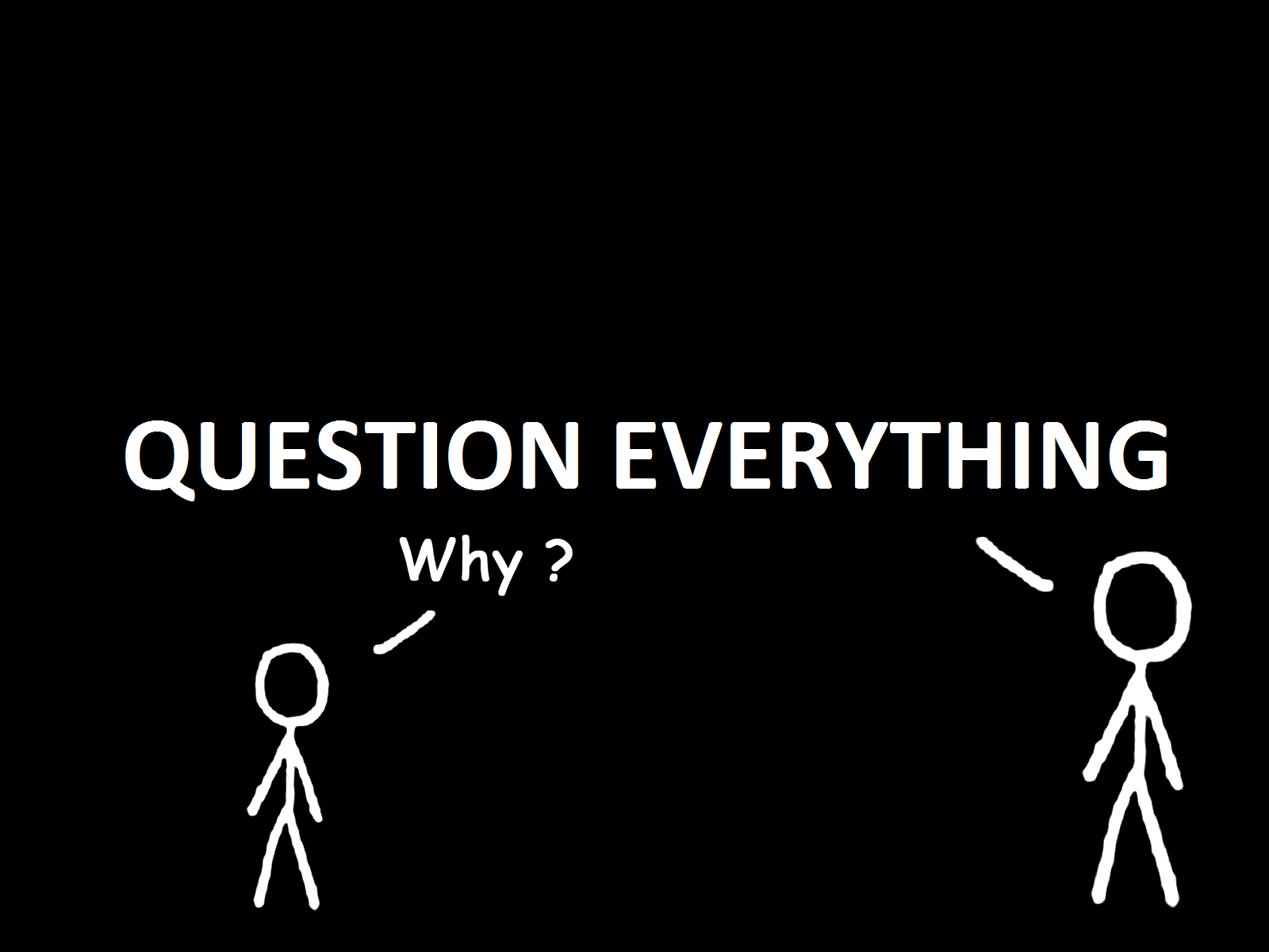 Description: A black background with a white text that says question everything why? and a stick figure with a stick figure pointing at it.