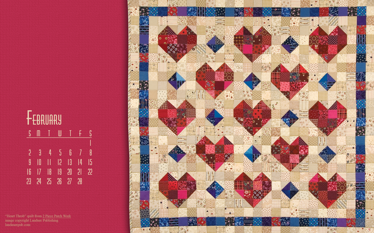 Description: A quilted wall hanging with hearts on it and a calendar on the wall behind it that says valentine.