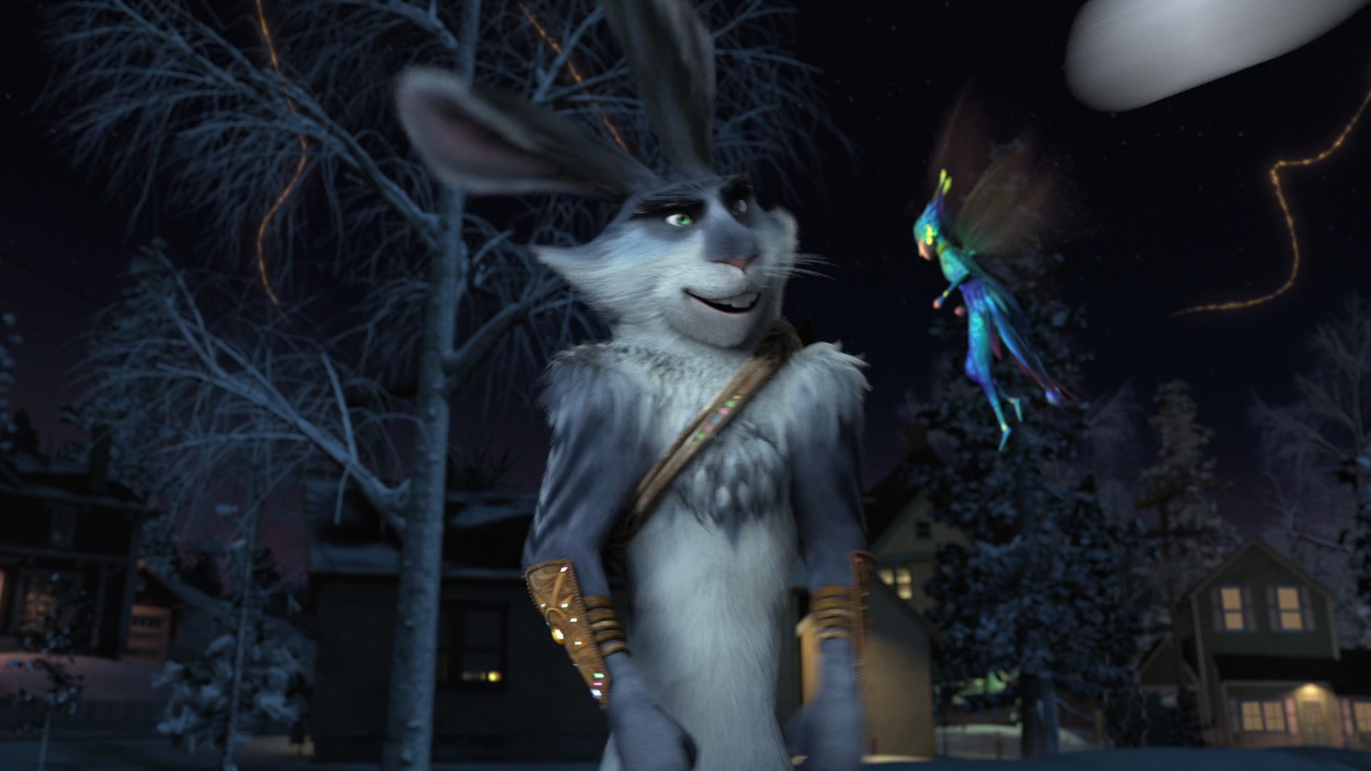 Description: A rabbit dressed as a fairy with a sword and a bird flying above it in the night sky with a house in the background.