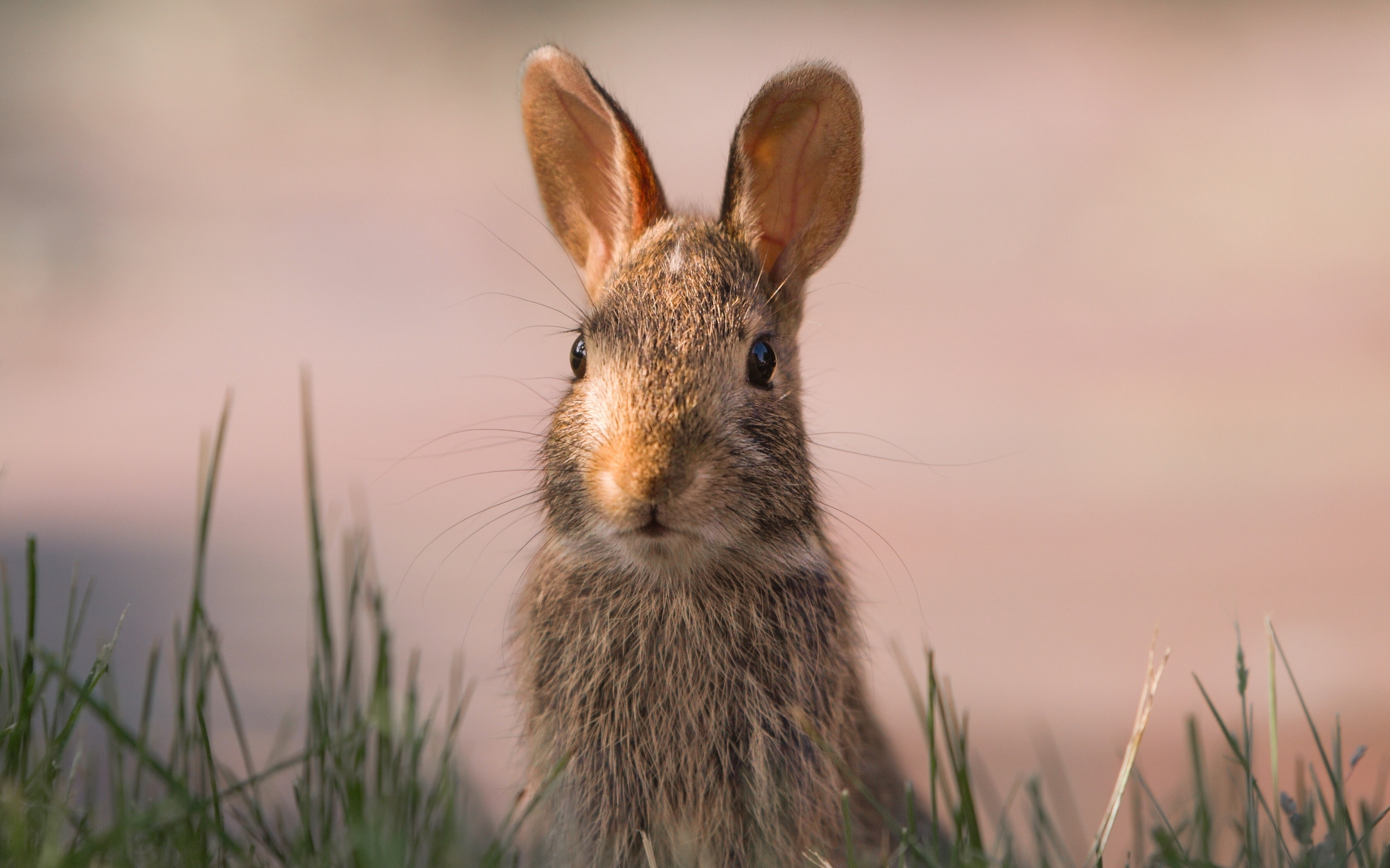 Description: A close up of a rabbit in a field of grass with a sky background and a pink sky in the background.