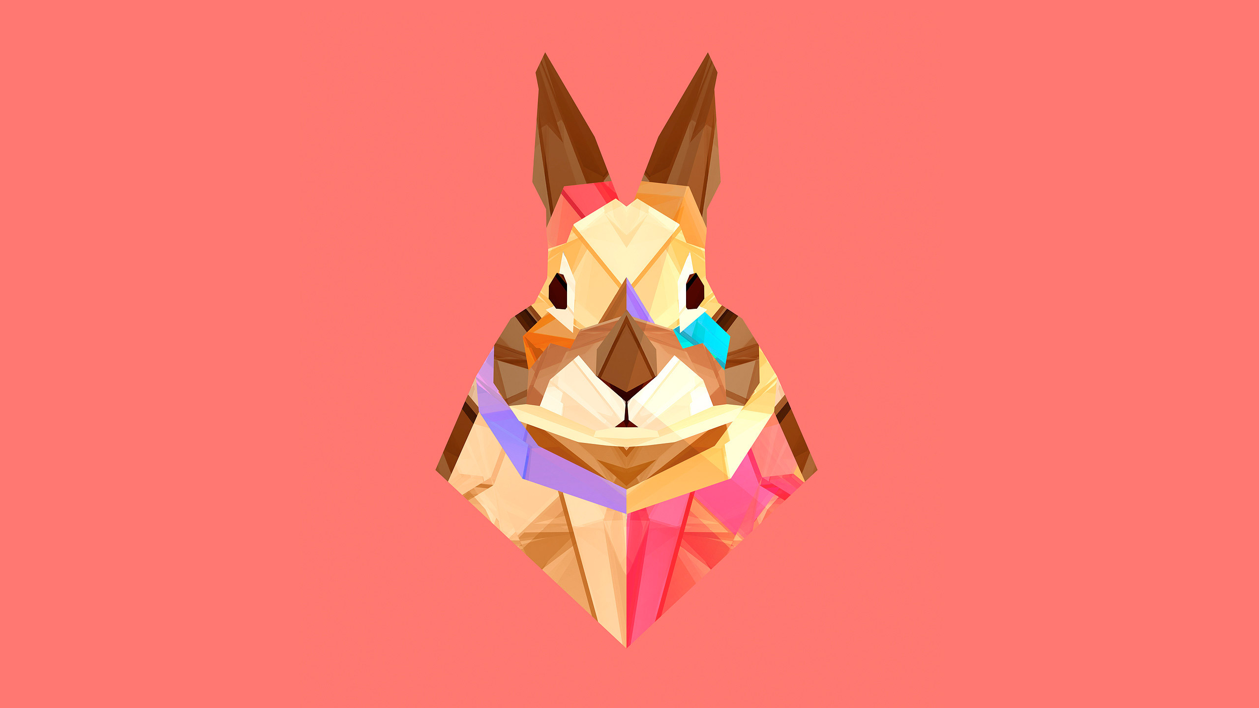 Description: A rabbit made of geometric shapes on a pink background with a blue bow in its mouth and a pink background.