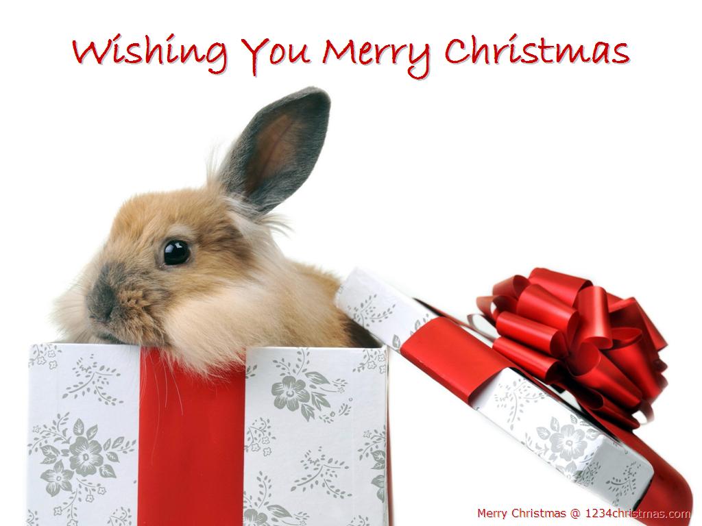 Description: A rabbit in a gift box with a red ribbon and a red bow on it's head and a merry christmas message.